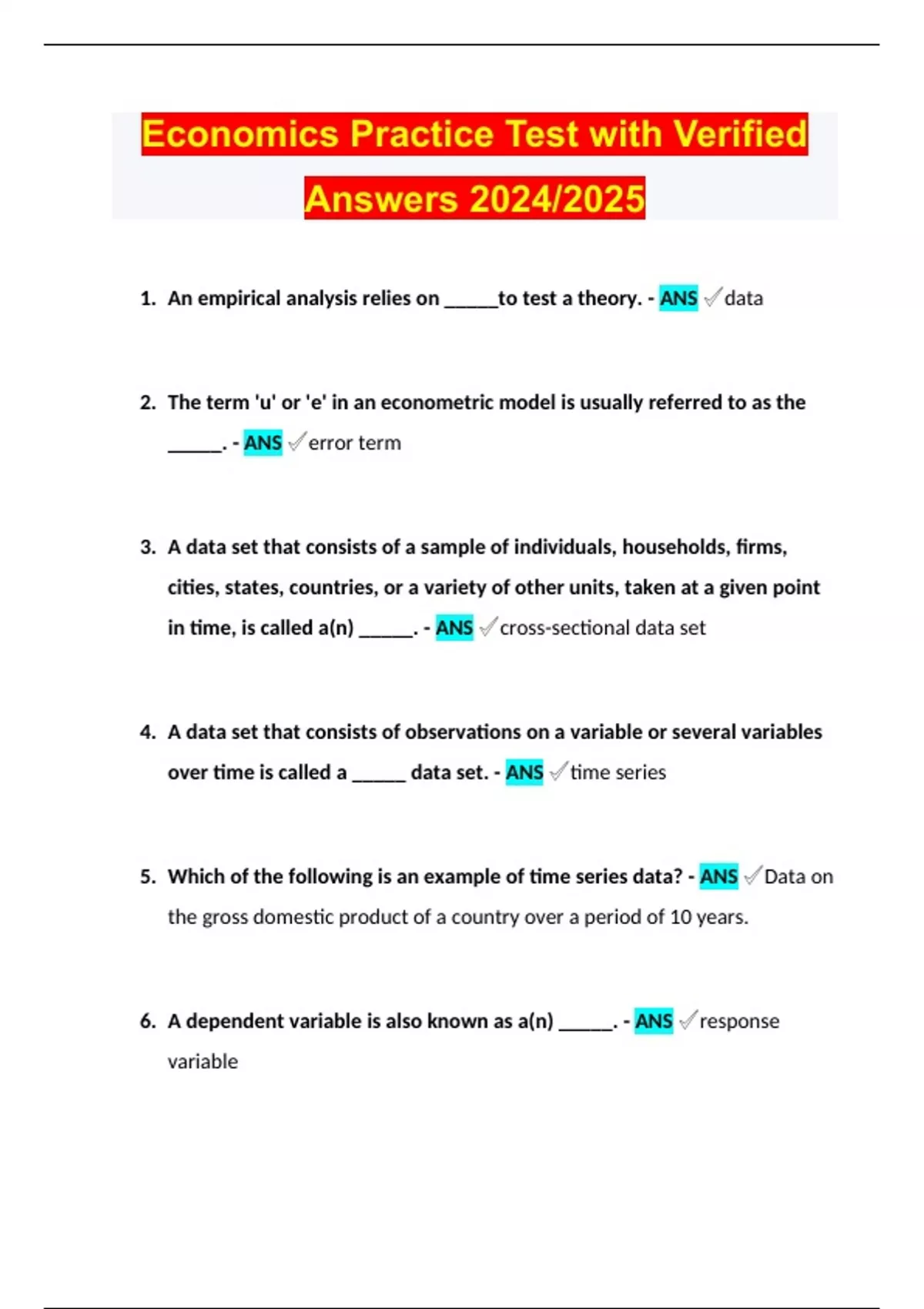 1. An empirical analysis relies on _____to test a theory. - ANS ✔data