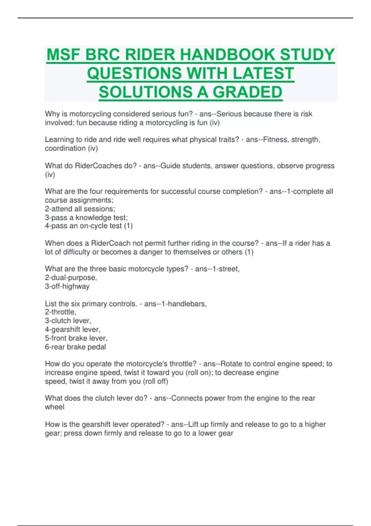 MSF - Basic Riders Course QUESTIONS WITH LATEST SOLUTIONS A GRADED