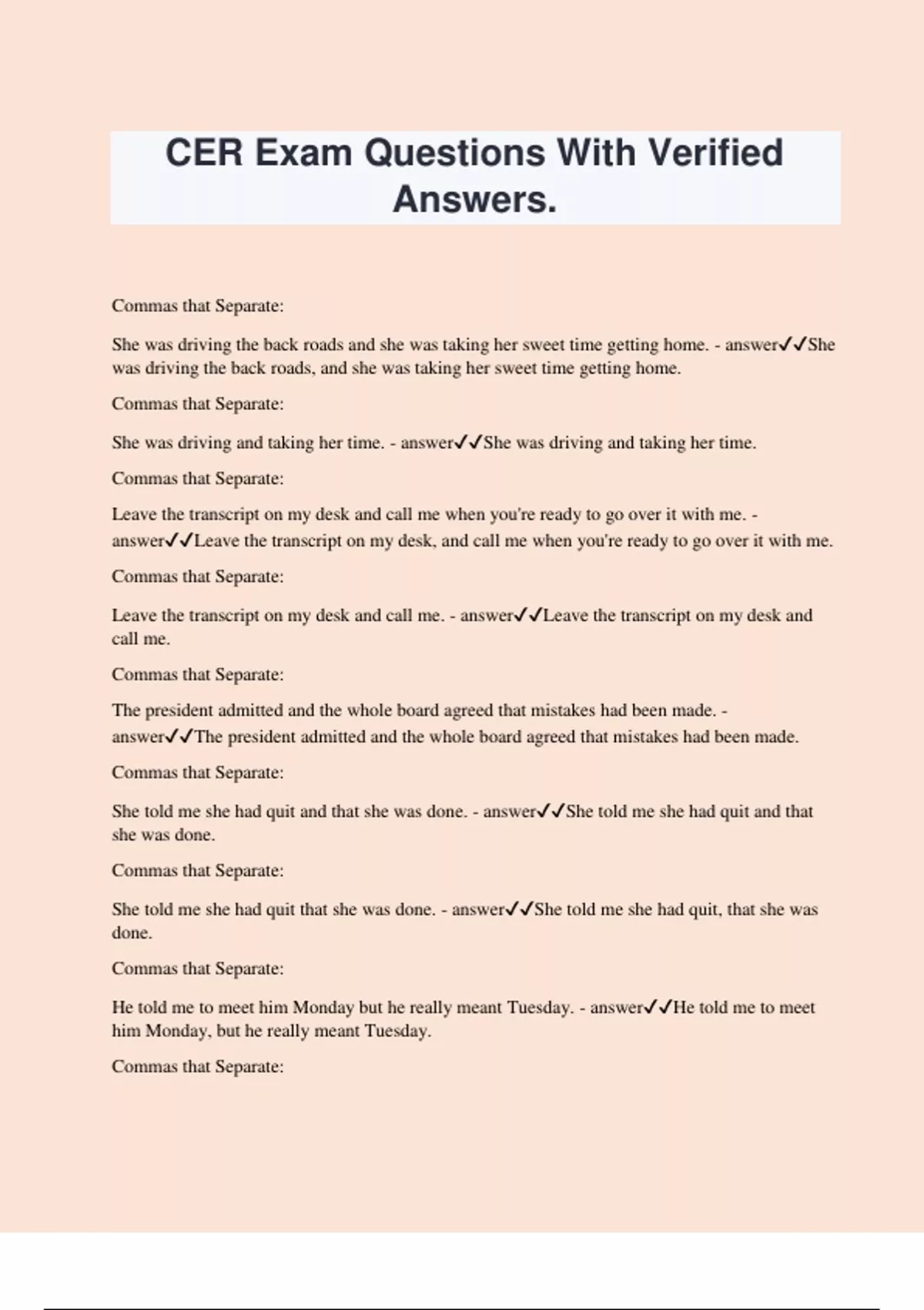 CER Exam Questions With Verified Answers. Commas that Separate: She was driving the back roads and she was taking her sweet time getting home. - answerShe was driving the back roads, and she was taking her sweet time getting home. Commas that Separate: She was driving and taking her time. - answerShe was driving and taking her time. Commas that Separate: Leave the transcript on my desk and call me when you're ready to go over it with me. - answerLeave the transcript on my desk, and call me when you're ready to go over it with me. Commas that Separate: Leave the transcript on my desk and call me. - answerLeave the transcript on my desk and call me. Commas that Separate: The president admitted and the whole board agreed that mistakes had been made. - answerThe president admitted and the whole board agreed that mistakes had been made. Commas that Separate: She told me she had quit and that she was done. - answerShe told me she had quit and that she was done. Commas that Separate: She told me she had quit that she was done. - answerShe told me she had quit, that she was done. Commas that Separate: He told me to meet him Monday but he really meant Tuesday. - answerHe told me to meet him Monday, but he really meant Tuesday. Commas that Separate: He told me to meet him Monday he really meant Tuesday. - answerHe told me to meet him Monday. He really meant Tuesday. Commas that Separate: He had the transcript done and yet didn't file it. - answerHe had the transcript done and yet didn't file it. Commas that Separate: He had the transcript done yet didn't file it. - answerHe had the transcript done, yet didn't file it. Commas that Separate: I know all the punctuation rules Jane knows the medical terms. - answerI know all the punctuation rules; Jane knows the medical terms. Commas that Separate: I know all the punctuation rules Jane, medical terms. - answerI know all the punctuation rules; Jane, the medical terms. Commas that Separate: John was the court recorder and James was the bailiff. - answerJohn was the court recorder, and James was the bailiff. Commas that Separate: John was the court recorder and James the bailiff. - answerJohn was the court recorder and James the bailiff. Commas that Separate: You are a smart hard-working student. - answerYou are a smart, hard-working student. Commas that Separate: Balancing a family and a career is often very very stressful. - answerBalancing a family and a career is often very, very stressful. Commas that Separate: He finished the transcript however it was apparent he did not proofread it. - answerHe finished the transcript; however, it was clear he did not proofread it. Commas that Separate: It was identified as maybe dark gray black dark silver. - answerIt was identified as maybe dark gray, black, dark silver. Commas that Separate: I don't have People's Exhibit No. 1 No. 2 or No. 3 - answerI don't have People's Exhibit No. 1, No. 2, or No. 3. Commas that Separate: The harder I work the more I get behind. - answerThe harder I work, the more I get behind. Commas that Separate: I vacationed in Punta Gorda Florida. - answerI vacationed in Punta Gorda, Florida. Commas that Separate: Punta Gorda 33309 is my Florida vacation spot. - answerPunta Gorda 33309 is my Florida vacation spot. Commas that Separate: The exam is scheduled for October 5 2016. - answerThe exam is scheduled for October 5, 2016. Commas that Separate: Frederick Charles Crawford Sr. was the defendant. - answerFrederick Charles Crawford, Sr. was the defendant. Commas that Separate: She works at home not just in her office. - answerShe works at home, not just in her office. Commas that Seperate: It was my mother not my father. - answerIt was my mother, not my father. Commas that Separate: He always listened seldom complained. - answerHe always listened, seldom complained. Commas that Separate: He always listened but seldom complained. - answerHe always listened but seldom complained. Commas that Separate: It was my mother and not my father. - answerIt was my mother and not my father. Commas that Separate: She asked "Where is the fire?" - answerShe asked, "Where is the fire?"