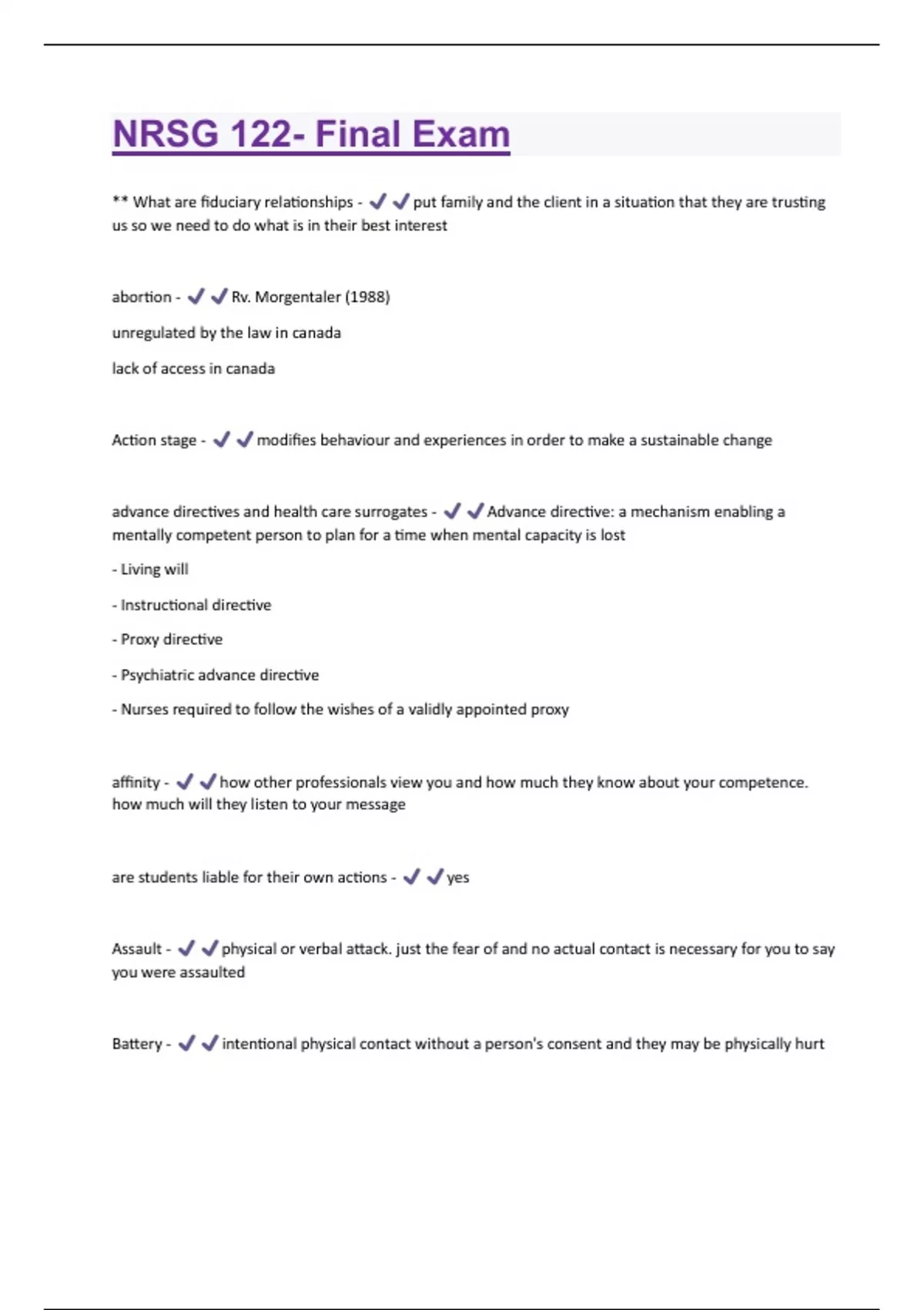 ** What are fiduciary relationships - put family and the client in a situation that they are trusting us so we need to do what is in their best interest abortion - Rv. Morgentaler (1988) unregulated by the law in canada lack of access in canada Action stage - modifies behaviour and experiences in order to make a sustainable change advance directives and health care surrogates - Advance directive: a mechanism enabling a mentally competent person to plan for a time when mental capacity is lost - Living will - Instructional directive - Proxy directive - Psychiatric advance directive - Nurses required to follow the wishes of a validly appointed proxy affinity - how other professionals view you and how much they know about your competence. how much will they listen to your message are students liable for their own actions - yes Assault - physical or verbal attack. just the fear of and no actual contact is necessary for you to say you were assaulted Battery - intentional physical contact without a person's consent and they may be physically hurtCharacteristics of the planning process when integrating the nursing process - - developing learning objectives - setting priorities - timing - organizing teaching material - maintaining attention and promoting participation - building on existing knowledge - selecting teaching methods - selecting resources - writing teaching plans collaborative leadership - communicable diseases - - nurses have ethical and legal obligation to provide care to all assigned patients - employers have an obligation to provide employees with necessary protective gear - nurses must balance the rights of protecting themselves with protecting the patient's rights Comtemplation stage - is aware of need for change and intends to change behaviour sometime in the future control - openness is often related to the power they hold over you Criminal code of Canada and the privacy act are under provincial or federal laws - federal drug regulations and nurses role - - nurses are NOT legally entitled to prescribe medications however they administer medications with physician's/prescriber's orders - MUST know the purpose, effect, potential adverse effects, and contradictions of any medication administered - may be found negligent if they follow a prescriber's order that is unclear or correctend-of-life issues - legal right to refuse life-prolonging treatment, legal right to refuse lifeprolonging treatment, euthanasia, assisted suicide, MAID False imprisonment - could be restraining someone against their wishes floating - bases on census load and acuteness of patients' conditions How can nurses prevent negligence - reviewing standards of practice and scope of practice, prioritizing your workflow, ask for help when needed, insisting on appropriate orientation How is the nursing and teaching process integrated - - both require assessment, nursing diagnosis, planning, implementation, and evaluation - nursing process is more broad immediacy - how urgent your message is will influence how it is received by the professionals In what ways are a patient's motivation assessed - - behaviour - health benefits and perception or a health problem and barriers to treatment - perceived ability to complete a required healthy behaviour - desire to learn - attitudes about health care providers - knowledge of information to be learned - pain, fatigue, anxiety, or other physical symptoms and values about health and various therapies - sociocultural background - learning style preference