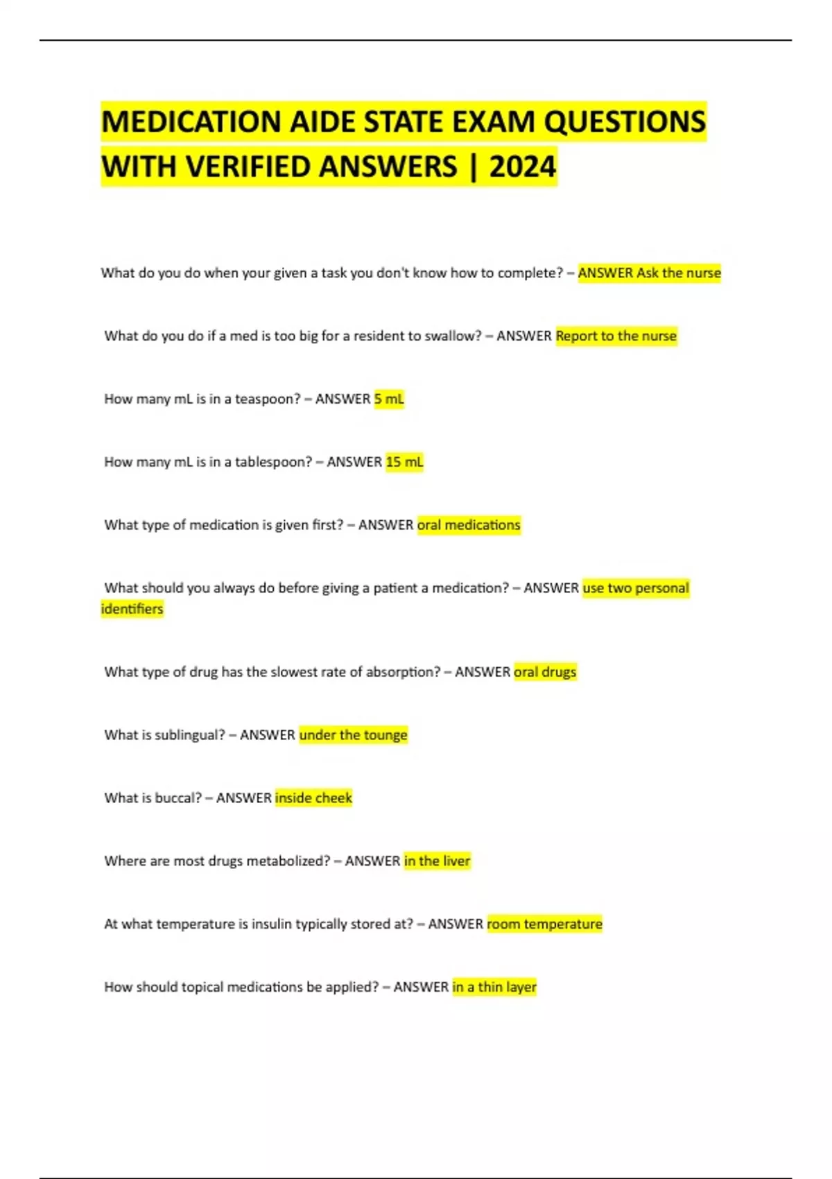 MEDICATION AIDE STATE EXAM QUESTIONS WITH VERIFIED ANSWERS | 2024 What do you do when your given a task you don't know how to complete? – ANSWER Ask the nurse What do you do if a med is too big for a resident to swallow? – ANSWER Report to the nurse How many mL is in a teaspoon? – ANSWER 5 mL How many mL is in a tablespoon? – ANSWER 15 mL What type of medication is given first? – ANSWER oral medications What should you always do before giving a patient a medication? – ANSWER use two personal identifiers What type of drug has the slowest rate of absorption? – ANSWER oral drugs What is sublingual? – ANSWER under the tounge What is buccal? – ANSWER inside cheek Where are most drugs metabolized? – ANSWER in the liver At what temperature is insulin typically stored at? – ANSWER room temperature How should topical medications be applied? – ANSWER in a thin layer What must you do with all medicated lotions? – ANSWER shake them first What should you instruct patient to do after giving eye drops or applying eye ointment? - ANSWER gently close their eyes Whats a common side effect of glaucoma drops? – ANSWER temporary redness and stinging Medications used to soften earwax is called? – ANSWER cerumenolytics What must you do when giving nasal spray? – ANSWER be sure to use an alcohol swab to clean before switching nostrils How long do you wait in-between giving two inhalation drugs? – ANSWER one minute What position should a patient be in before giving vaginal medications? – ANSWER lithotomy What type of drug treats pain but also inflammation and swelling? – ANSWER NSAID (nonsteroidal anti-inflammatory drugs) What is a common symptom of a blood clot? – ANSWER pain and swelling in lower leg What suppresses the cough? – ANSWER antitussives What thins the mucus? - ANSWER exporants When should you give thyroid medications? – ANSWER 1-2 hours after meals When should you give Fosamax (to treat PMS) – ANSWER 30 minutes before meals with water