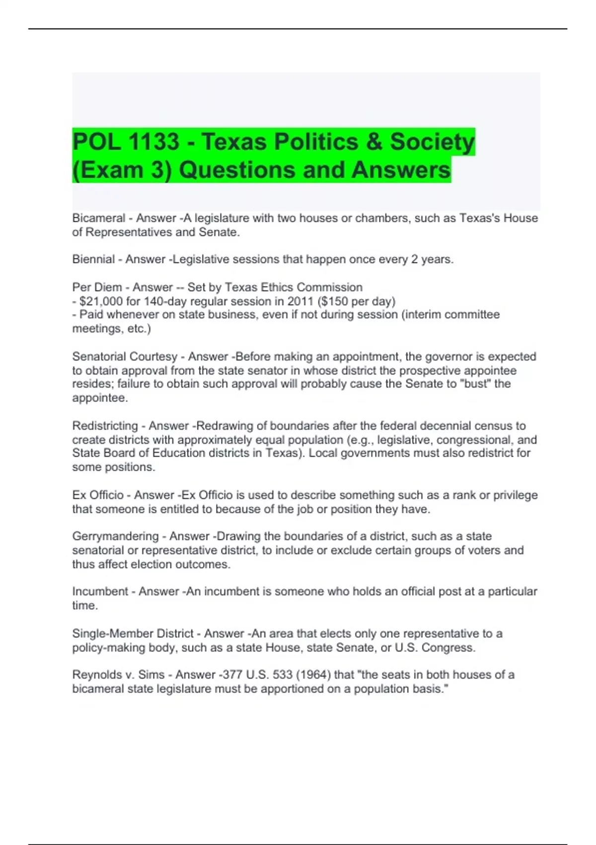 POL 1133 - Texas Politics & Society (Exam 3) Questions and Answers