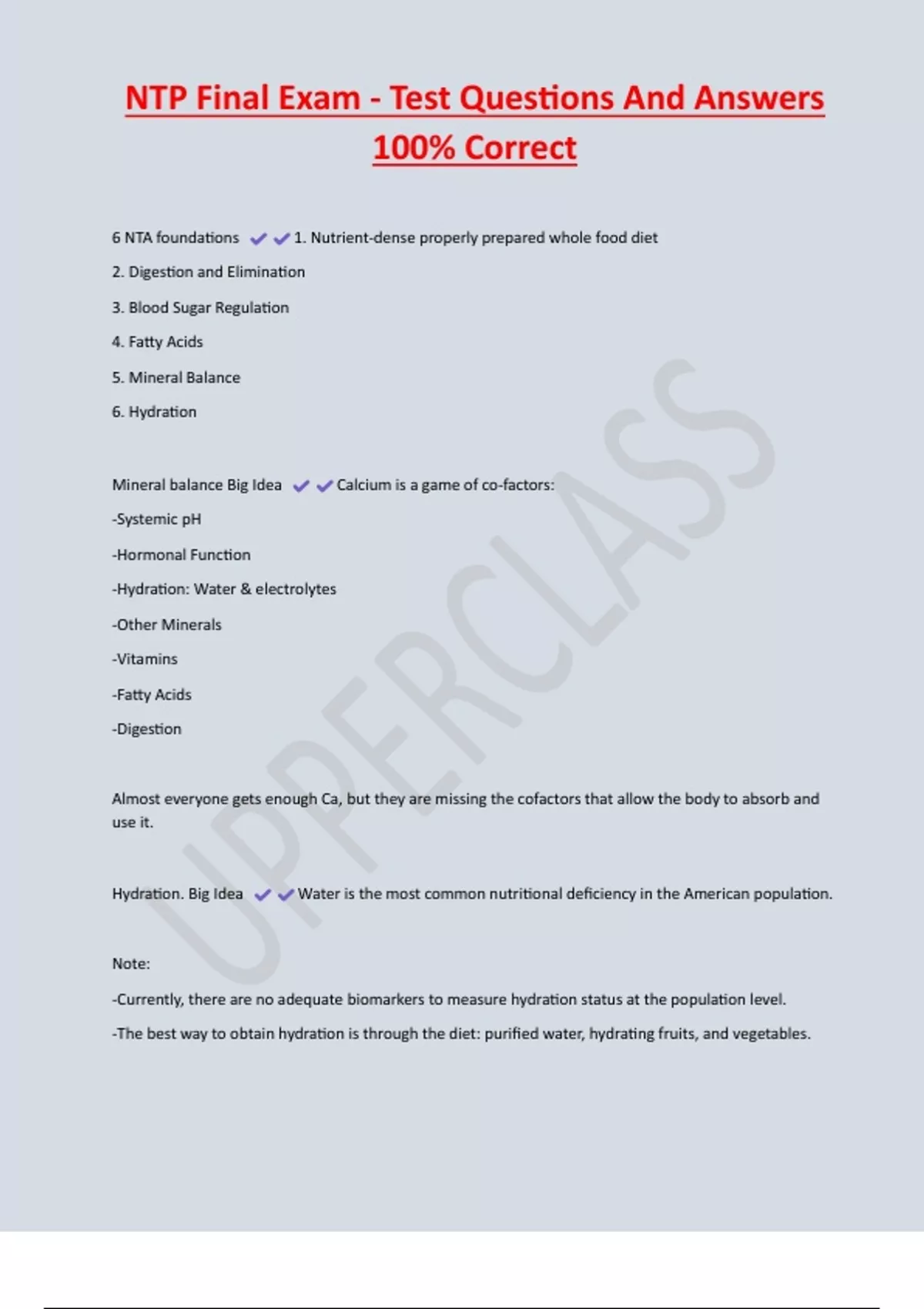 NTP Final Exam - Test Questions And Answers 100% Correct 6 NTA foundations 1. Nutrient-dense properly prepared whole food diet 2. Digestion and Elimination 3. Blood Sugar Regulation 4. Fatty Acids 5. Mineral Balance 6. Hydration Mineral balance Big Idea Calcium is a game of co-factors: -Systemic pH -Hormonal Function -Hydration: Water & electrolytes -Other Minerals -Vitamins -Fatty Acids -Digestion Almost everyone gets enough Ca, but they are missing the cofactors that allow the body to absorb and use it. Hydration. Big Idea Water is the most common nutritional deficiency in the American population