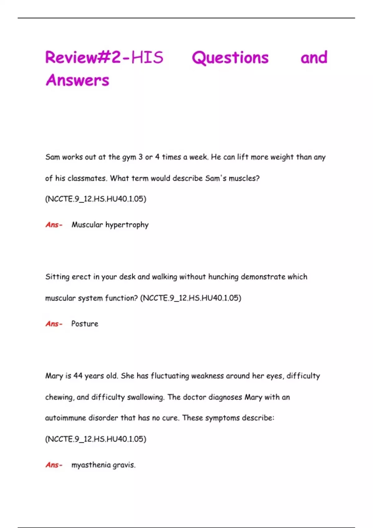 Sam works out at the gym 3 or 4 times a week. He can lift more weight than any of his classmates. What term would describe Sam's muscles? (NCCTE.9_12.HS.HU40.1.05) Ans- Muscular hypertrophy Sitting erect in your desk and walking without hunching demonstrate which muscular system function? (NCCTE.9_12.HS.HU40.1.05) Ans- Posture Mary is 44 years old. She has fluctuating weakness around her eyes, difficulty chewing, and difficulty swallowing. The doctor diagnoses Mary with an autoimmune disorder that has no cure. These symptoms describe: (NCCTE.9_12.HS.HU40.1.05) Ans- myasthenia gravis. Regular exercise and training will: (NCCTE.9_12.HS.HU40.1.05) Ans- improve muscle tone. When Joe flexes his bicep, what characteristic of muscles describes what is happening to his bicep? (NCCTE.9_12.HS.HU40.1.05) Ans- Contractibility Mary has muscl