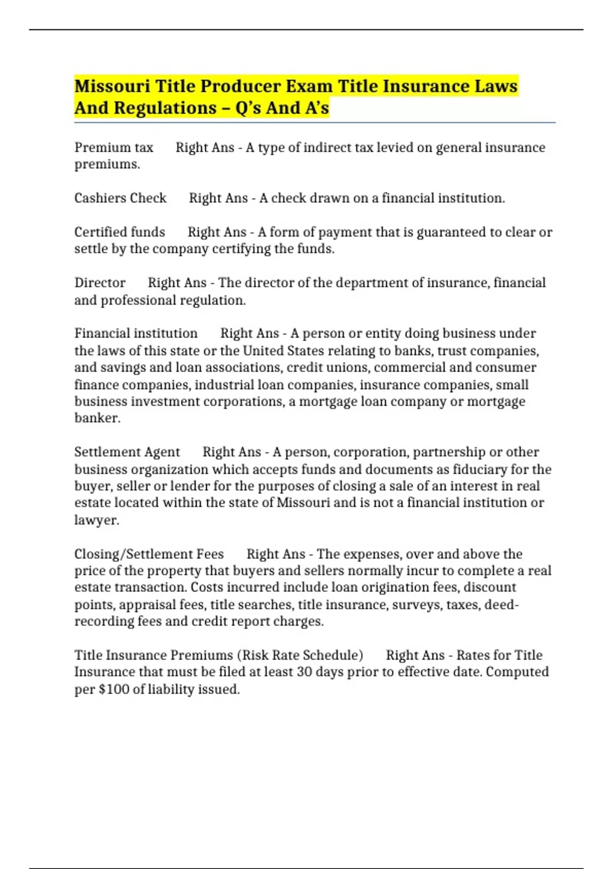 Title Insurance Premiums (Risk Rate Schedule) Right Ans - Rates for Title