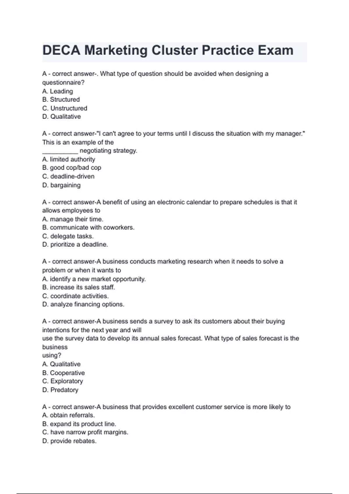 DECA Marketing Cluster Practice Exam questions and answers