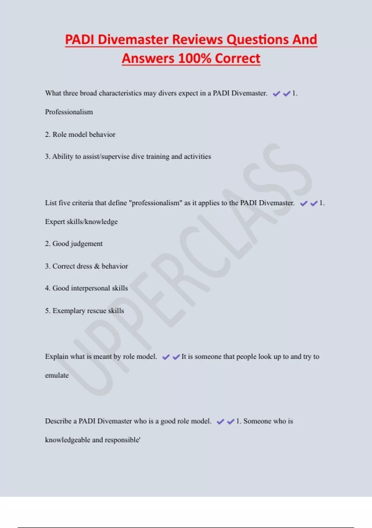 PADI Divemaster Reviews Questions And Answers 100% Correct What three broad characteristics may divers expect in a PADI Divemaster. 1. Professionalism 2. Role model behavior 3. Ability to assist/supervise dive training and activities List five criteria that define "professionalism" as it applies to the PADI Divemaster. 1. Expert skills/knowledge 2. Good judgement 3. Correct dress & behavior 4. Good interpersonal skills 5. Exemplary rescue skills