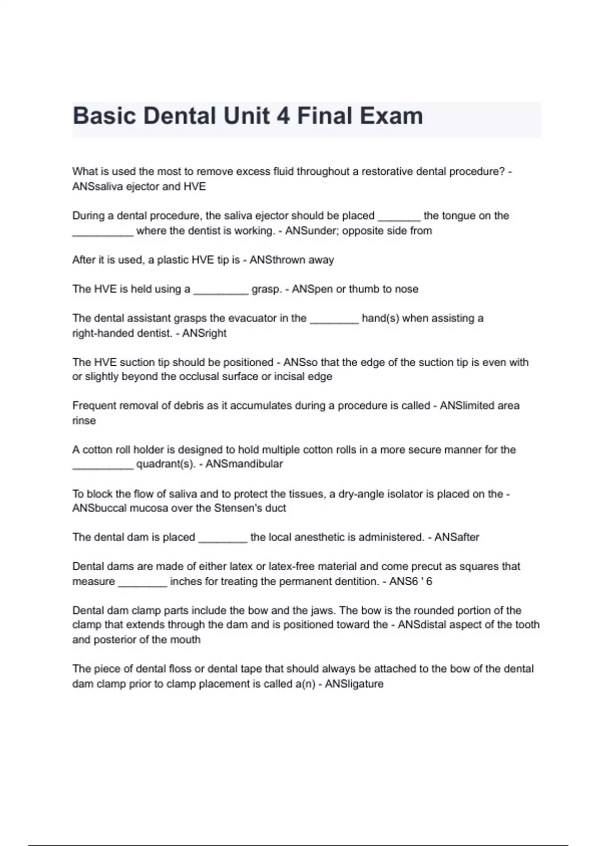Basic Dental Unit 4 Final Exam questions and answers graded A+ 2024/2025