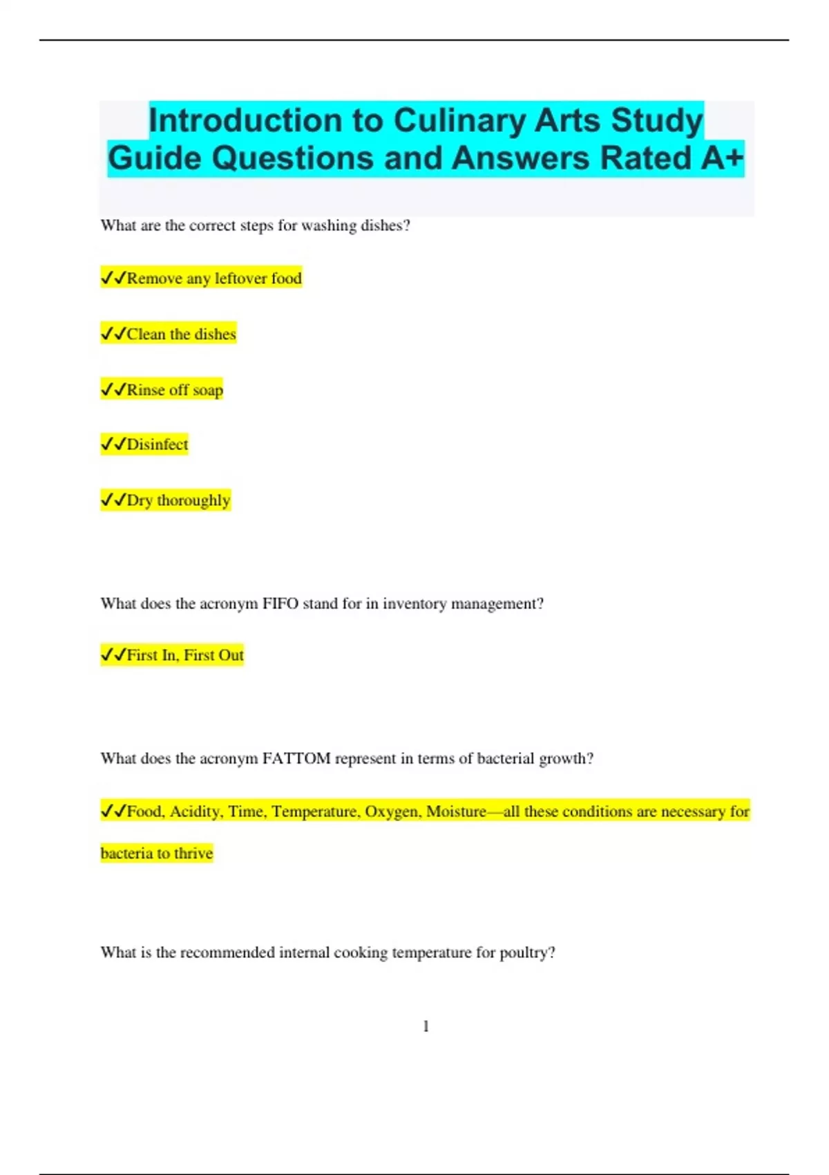 Introduction to Culinary Arts Study Guide Questions and Answers Rated A+ What are the correct steps for washing dishes? Remove any leftover food Clean the dishes Rinse off soap Disinfect Dry thoroughly What does the acronym FIFO stand for in inventory management? First In, First Out What does the acronym FATTOM represent in terms of bacterial growth? Food, Acidity, Time, Temperature, Oxygen, Moisture—all these conditions are necessary for bacteria to thrive What is the recommended internal cooking temperature for poultry? 2 165 degrees Fahrenheit When is it necessary to change your gloves while preparing food? Immediately if they become dirty or damaged Before starting a new task At least every four hours if continuously used After handling raw meats and before touching cooked or ready-to-eat foods What are Safety Data Sheets (SDS)? Documents that detail the properties and risks of hazardous chemicals, including their effects on health and safety in the workplace What is a HACCP Plan? A systematic preventive approach to food safety that identifies and addresses biological, chemical, and physical hazards in food production processes to ensure the safety of the final product What is the sequence of reporting a foodborne illness outbreak? 3 Report to Local authorities, then to State