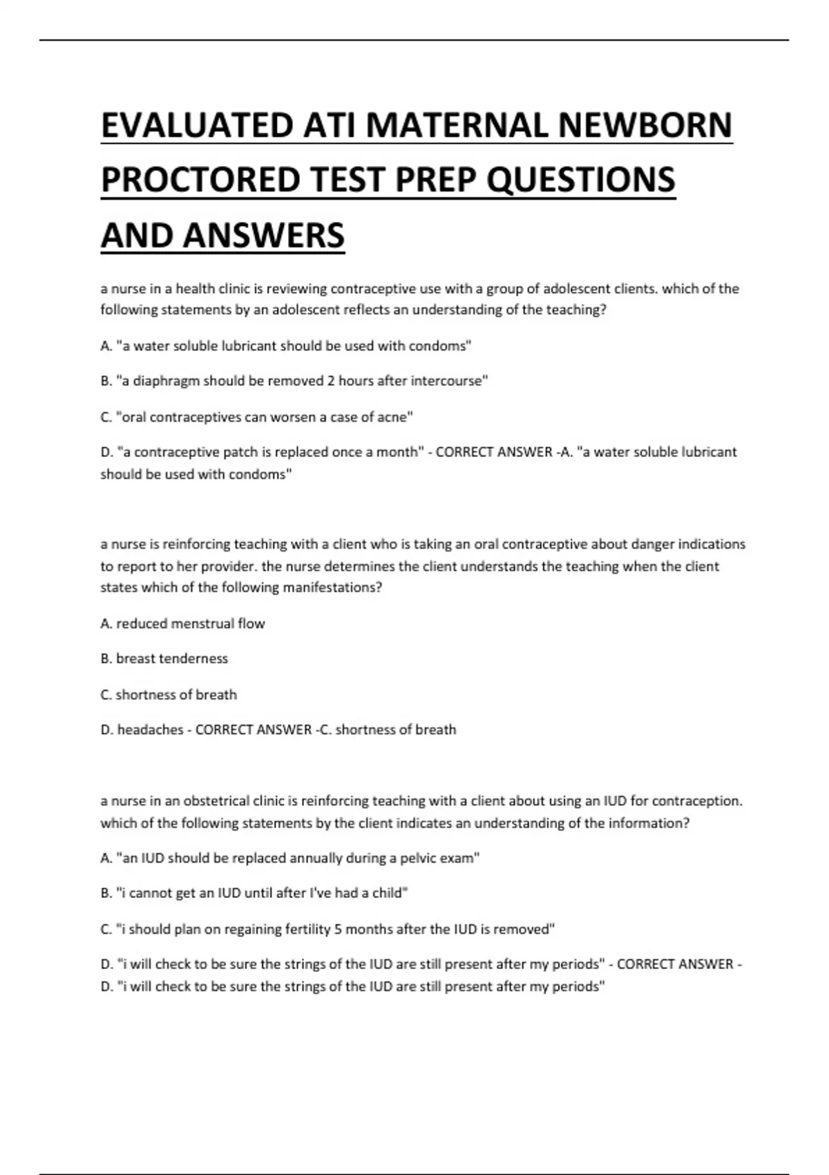 EVALUATED ATI MATERNAL NEWBORN PROCTORED TEST PREP QUESTIONS AND ANSWERS a nurse in a health clinic is reviewing contraceptive use with a group of adolescent clients. which of the following statements by an adolescent reflects an understanding of the teaching? A. "a water soluble lubricant should be used with condoms" B. "a diaphragm should be removed 2 hours after intercourse" C. "oral contraceptives can worsen a case of acne" D. "a contraceptive patch is replaced once a month" - CORRECT ANSWER -A. "a water soluble lubricant should be used with condoms" a nurse is reinforcing teaching with a client who is taking an oral contraceptive about danger indications to report to her provider. the nurse determines the client understands the teaching when the client states which of the following manifestations? A. reduced menstrual flow B. breast tenderness C. shortness of breath D. headaches - CORRECT ANSWER -C. shortness of breath a nurse in an obstetrical clinic is reinforcing teaching with a client about using an IUD for contraception. which of the following statements by the client indicates an understanding of the information? A. "an IUD should be replaced annually during a pelvic exam" B. "i cannot get an IUD until after I've had a child" C. "i should plan on regaining fertility 5 months after the IUD is removed" D. "i will check to be sure the strings of the IUD are still present after my periods" - CORRECT ANSWER D. "i will check to be sure the strings of the IUD are still present after my periods"