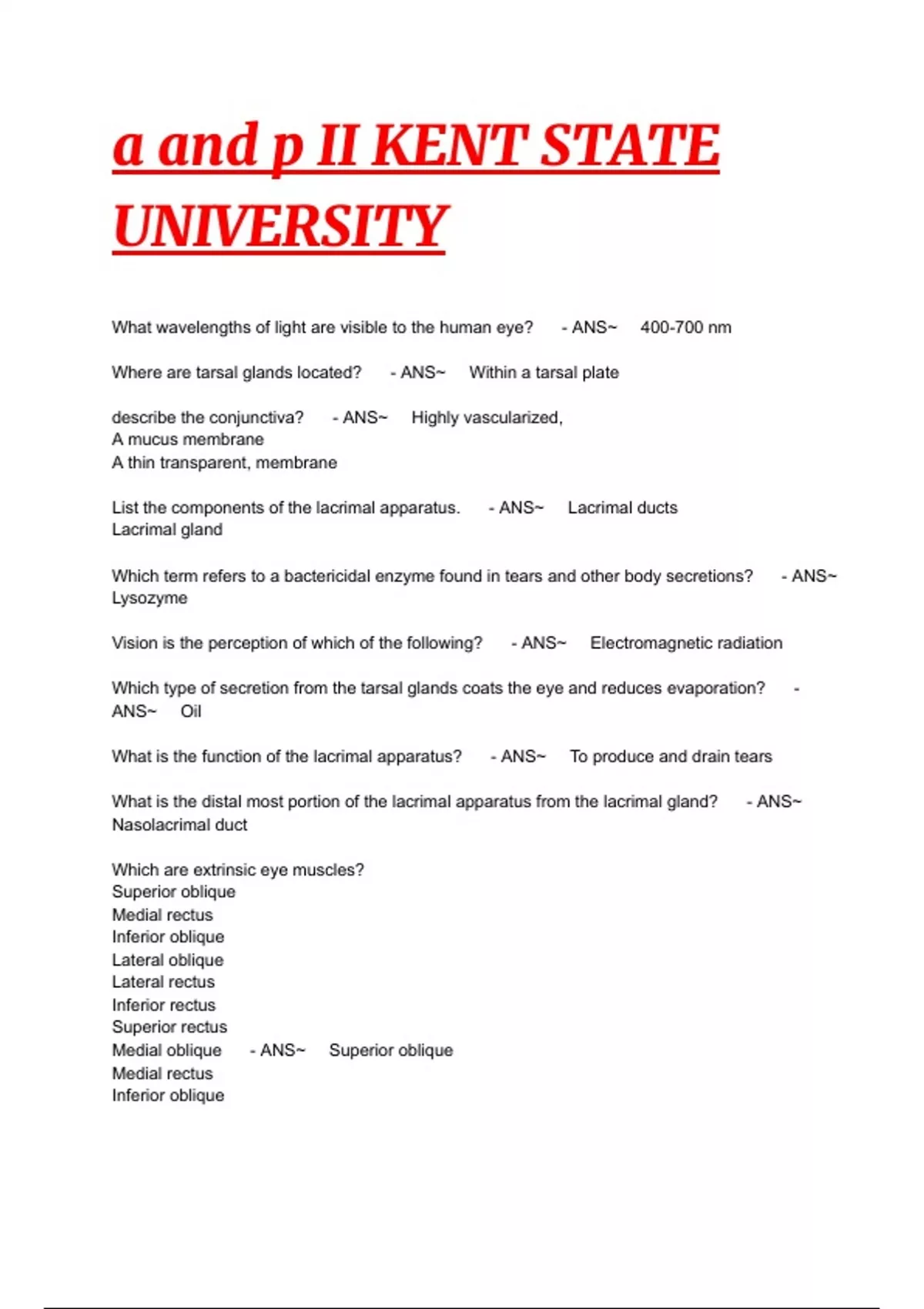 What wavelengths of light are visible to the human eye? - ANS~ 400-700 nm Where are tarsal glands located? - ANS~ Within a tarsal plate describe the conjunctiva? - ANS~ Highly vascularized, A mucus membrane A thin transparent, membrane List the components of the lacrimal apparatus. - ANS~ Lacrimal ducts Lacrimal gland Which term refers to a bactericidal enzyme found in tears and other body secretions? - ANS~ Lysozyme Vision is the perception of which of the following? - ANS~ Electromagnetic radiation Which type of secretion from the tarsal glands coats the eye and reduces evaporation? - ANS~ Oil What is the function of the lacrimal apparatus? - ANS~ To produce and drain tears What is the distal most portion of the lacrimal apparatus from the lacrimal gland? - ANS~ Nasolacrimal duct Which are extrinsic eye muscles? Superior oblique Medial rectus Inferior oblique Lateral oblique Lateral rectus Inferior rectus Superior rectus Medial oblique - ANS~ Superior oblique Medial rectus Inferior oblique Lateral rectus Inferior rectus Superior rectus The retina is part of which tunic of the eyeball? - ANS~ inner which duct connects the lacrimal apparatus to the nasal cavity. - ANS~ Nasolacrimal Which term refers to the outermost layer of the eyeball? - ANS~ Fibrous what is the translucent anterior section of the fibrous layer (tunic) of the eye called - ANS~ Cornea Which extrinsic eye muscle moves the eyeball laterally? - ANS~ Lateral rectus . Which structures are part of the outer, fibrous layer of the eyeball? - ANS~ Cornea Sclera Which term refers to the posterior, white portion of the fibrous layer? - ANS~ Sclera Which extrinsic eye muscle passes through the trochlea? - ANS~ Superior oblique Which structures are part of the vascular layer of the eyeball? - ANS~ Ciliary body Iris Choroid Which describe the choroid? Part of the inner tunic (layer) Highly pigmented Contains numerous capillaries Part of the vascular tunic (layer) - ANS~ Highly pigmented Contains numerous capillaries Part of the vascular tunic (layer) The ciliary body is part of which tunic of the eye? - ANS~ Vascular The colored portion of the eye surrounding the pupil is called the - ANS~ iris The vascular layer of the eye is also called the - ANS~ uvea what is a highly vascular, deeply pigmented portion of the vascular tunic located behind the retina called - ANS~ Choroid what body is an extension of the choroid that supports the iris and lens of the eye. - ANS~ ciliary what is the opening within the iris of the eye called - ANS~ pupil The choroid, ciliary body, and iris belong to which of the three tunics of the eye? - ANS~ Vascular Which describe the choroid? Part of the inner tunic (layer) Contains numerous capillaries Highly pigmented Part of the vascular tunic (layer) - ANS~ Contains numerous capillaries Highly pigmented Part of the vascular tunic (layer) The inner layer of the eye contains which of the following? Start of optic nerve Numerous capillaries Retina Numerous melanocytes - ANS~ Start of optic nerve Retina What fluid is found in the anterior chamber of the eye? - ANS~ Aqueous humor What is the function of the scleral venous sinus? - ANS~ reabsorption of aqueous humor .Which layer of the eyeball includes the retina? - ANS~ Internal Which fluid is secreted by the ciliary body and fills the anterior cavity of the eye? - ANS~ Aqueous humor The anterior chamber of the eye is located between which two structures? - ANS~ Cornea and iris Aqueous humor is reabsorbed from the anterior chamber into the blood by which of the following? Suspensory ligament Scleral venous sinus Vitreous humor Macula lutea Ora serrata - ANS~ Scleral venous sinus The suspensory ligament attaches the lens to which of the following structures? Pupil Retina Ciliary body Iris - ANS~ Ciliary body True or false: Inverted images are focused onto the retina by the lens. - ANS~ true Which structure secretes the aqueous humor? - ANS~ ciliary body what ligament attaches the lens of the eye to the ciliary body. - ANS~ Suspensory What is the function of the lens? - ANS~ The lens focuses light on the retina. The vitreous body, or humor, is a jelly-like substance located between what two structures of the eye? - ANS~ Lens and retina What are the neural components of the eye? - ANS~ retina and optic disc The posterior chamber of the eye is located between which two structures? - ANS~ Iris and lens The ora serrata is the scalloped margin of which structure? - ANS~ Retina The suspensory ligament attaches the lens to which of the following structures? - ANS~ ciliary body Which term refers to a patch of cells in the center of the retina? - ANS~ Macula lutea Which are functions of the vitreous body? Maintains intraocular pressure Focuses an image onto the retina Keeps retina smooth Provide a neural pathway for the retina - ANS~ Maintains intraocular pressure Keeps retina smooth Which structure contains photoreceptors? - ANS~ Retina Which instrument is used to examine the retina? - ANS~ Ophthalmoscope Which area of the retina lacks photoreceptors and is therefore referred to as the "blind spot"? - ANS~ Optic disc The retina is attached to the eye at the optic disc and at the ora ___? - ANS~ Serrata Which portion of the retina produces the greatest visual acuity (sharpness of image)? - ANS~ Fovea centralis Which describes the optic disc? - ANS~ An area of the retina lacking photoreceptors Which are functions of the vitreous body? - ANS~ Maintains intraocular pressure Keeps retina smooth The pupillary constrictor muscle is under direct control of which branch of the nervous system? - ANS~ Parasympathetic Which statement about the pupillary dilator is true? It consists of a spoke-like arrangement of myoepithelial cells. It receives parasympathetic innervation. It constricts the pupil in bright light. It narrows the pupil. - ANS~ It consists of a spoke-like arrangement of myoepithelial cells. what reflex refers to the ability of the pupil to respond to the intensity of ligh