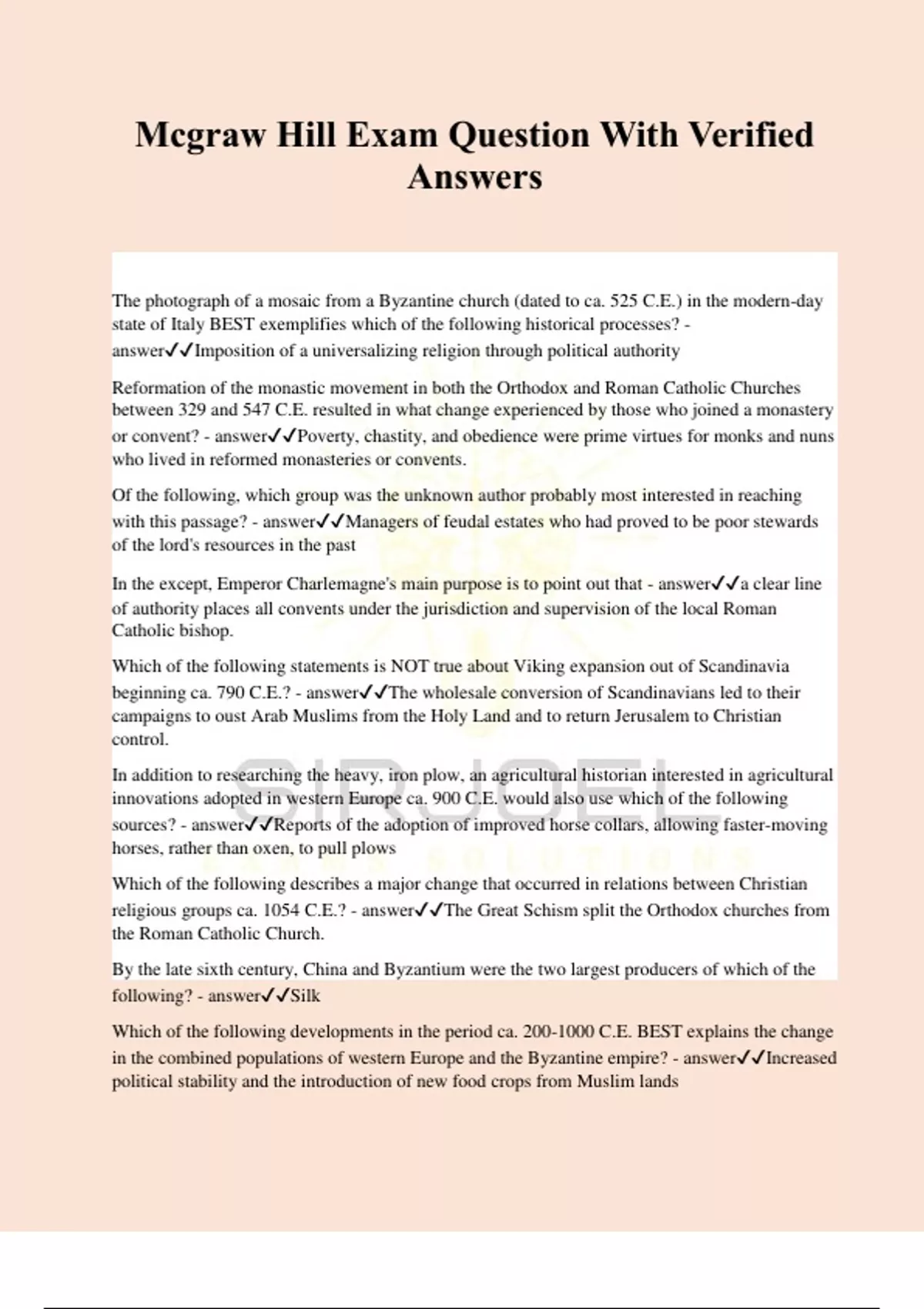 Mcgraw Hill Exam Question With Verified Answers The photograph of a mosaic from a Byzantine church (dated to ca. 525 C.E.) in the modern-day state of Italy BEST exemplifies which of the following historical processes? - answerImposition of a universalizing religion through political authority Reformation of the monastic movement in both the Orthodox and Roman Catholic Churches between 329 and 547 C.E. resulted in what change experienced by those who joined a monastery or convent? - answerPoverty, chastity, and obedience were prime virtues for monks and nuns who lived in reformed monasteries or convents. Of the following, which group was the unknown author probably most interested in reaching with this passage? - answerManagers of feudal estates who had proved to be poor stewards of the lord's resources in the past In the except, Emperor Charlemagne's main purpose is to point out that - answera clear line of authority places all convents under the jurisdiction and supervision of the local Roman Catholic bishop. Which of the following statements is NOT true about Viking expansion out of Scandinavia beginning ca. 790 C.E.? - answerThe wholesale conversion of Scandinavians led to their campaigns to oust Arab Muslims from the Holy Land and to return Jerusalem to Christian control. In addition to researching the heavy, iron plow, an agricultural historian interested in agricultural innovations adopted in western Europe ca. 900 C.E. would also use which of the following sources? - answerReports of the adoption of improved horse collars, allowing faster-moving horses, rather than oxen, to pull plows Which of the following describes a major change that occurred in relations between Christian religious groups ca. 1054 C.E.? - answerThe Great Schism split the Orthodox churches from the Roman Catholic Church. By the late sixth century, China and Byzantium were the two largest producers of which of the following? - answerSilk Which of the following developments in the period ca. 200-1000 C.E. BEST explains the change in the combined populations of western Europe and the Byzantine empire? - answerIncreased political stability and the introduction of new food crops from Muslim lands