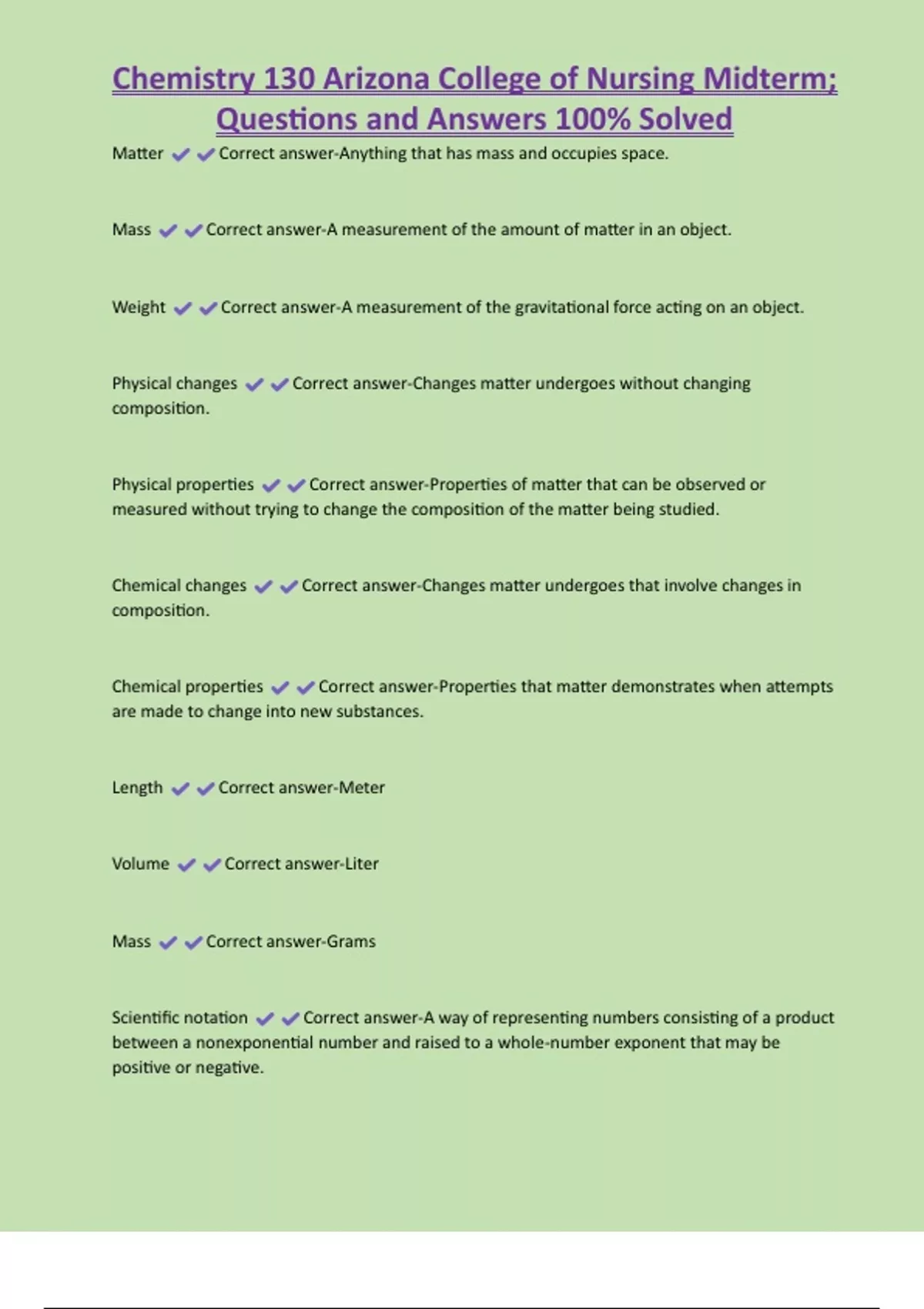 Chemistry 130 Arizona College of Nursing Midterm; Questions and Answers 100% Solved Matter Correct answer-Anything that has mass and occupies space. Mass Correct answer-A measurement of the amount of matter in an object. Weight Correct answer-A measurement of the gravitational force acting on an object. Physical changes Correct answer-Changes matter undergoes without changing composition. Physical properties Correct answer-Properties of matter that can be observed or measured without trying to change the composition of the matter being studied