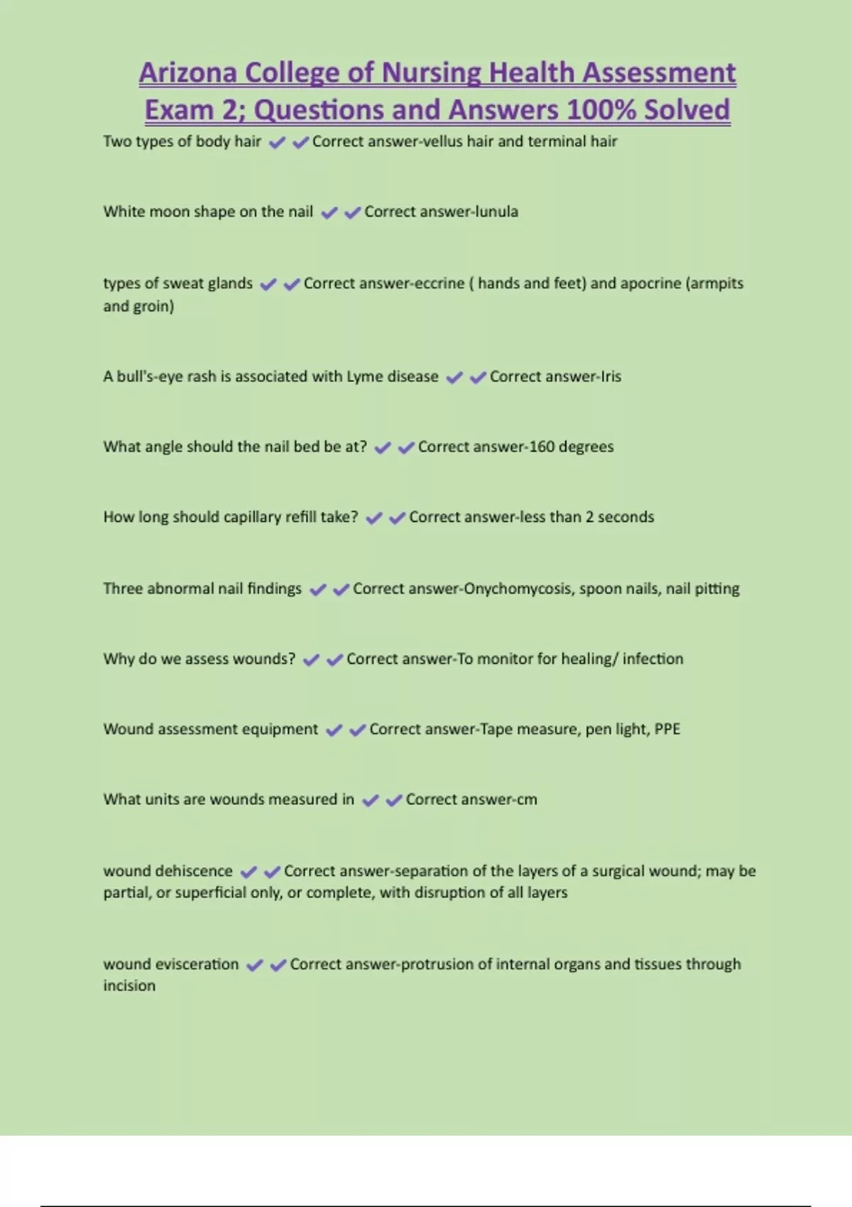 Arizona College of Nursing Health Assessment Exam 2; Questions and Answers 100% Solved Two types of body hair Correct answer-vellus hair and terminal hair White moon shape on the nail Correct answer-lunula types of sweat glands Correct answer-eccrine ( hands and feet) and apocrine (armpits and groin) A bull's-eye rash is associated with Lyme disease Correct answer-Iris What angle should the nail bed be at? Correct answer-160 degrees How long should capillary refill take? Correct answer-less than 2 seconds