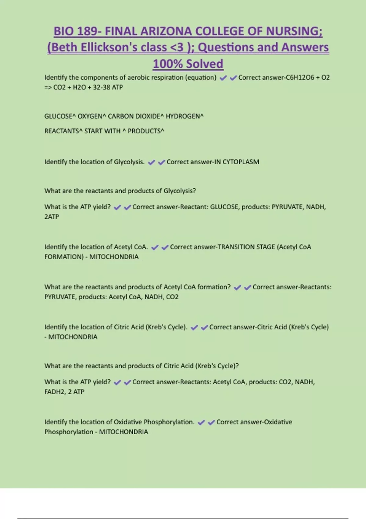 BIO 189- FINAL ARIZONA COLLEGE OF NURSING; (Beth Ellickson's class <3 ); Questions and Answers 100% Solved Identify the components of aerobic respiration (equation) Correct answer-C6H12O6 + O2 => CO2 + H2O + 32-38 ATP GLUCOSE^ OXYGEN^ CARBON DIOXIDE^ HYDROGEN^ REACTANTS^ START WITH ^ PRODUCTS^ Identify the location of Glycolysis. Correct answer-IN CYTOPLASM What are the reactants and products of Glycolysis? What is the ATP yield? Correct answer-Reactant: GLUCOSE, products: PYRUVATE, NADH, 2ATP Identify the location of Acetyl CoA. Correct answer-TRANSITION STAGE (Acetyl CoA FORMATION) - MITOCHONDRIA