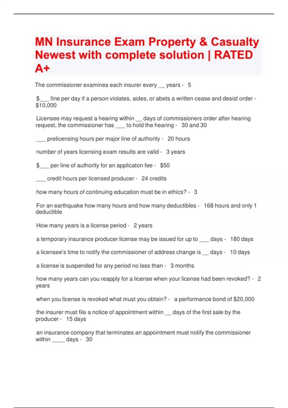 MN Insurance Exam Property & Casualty Newest with complete solution | RATED A+