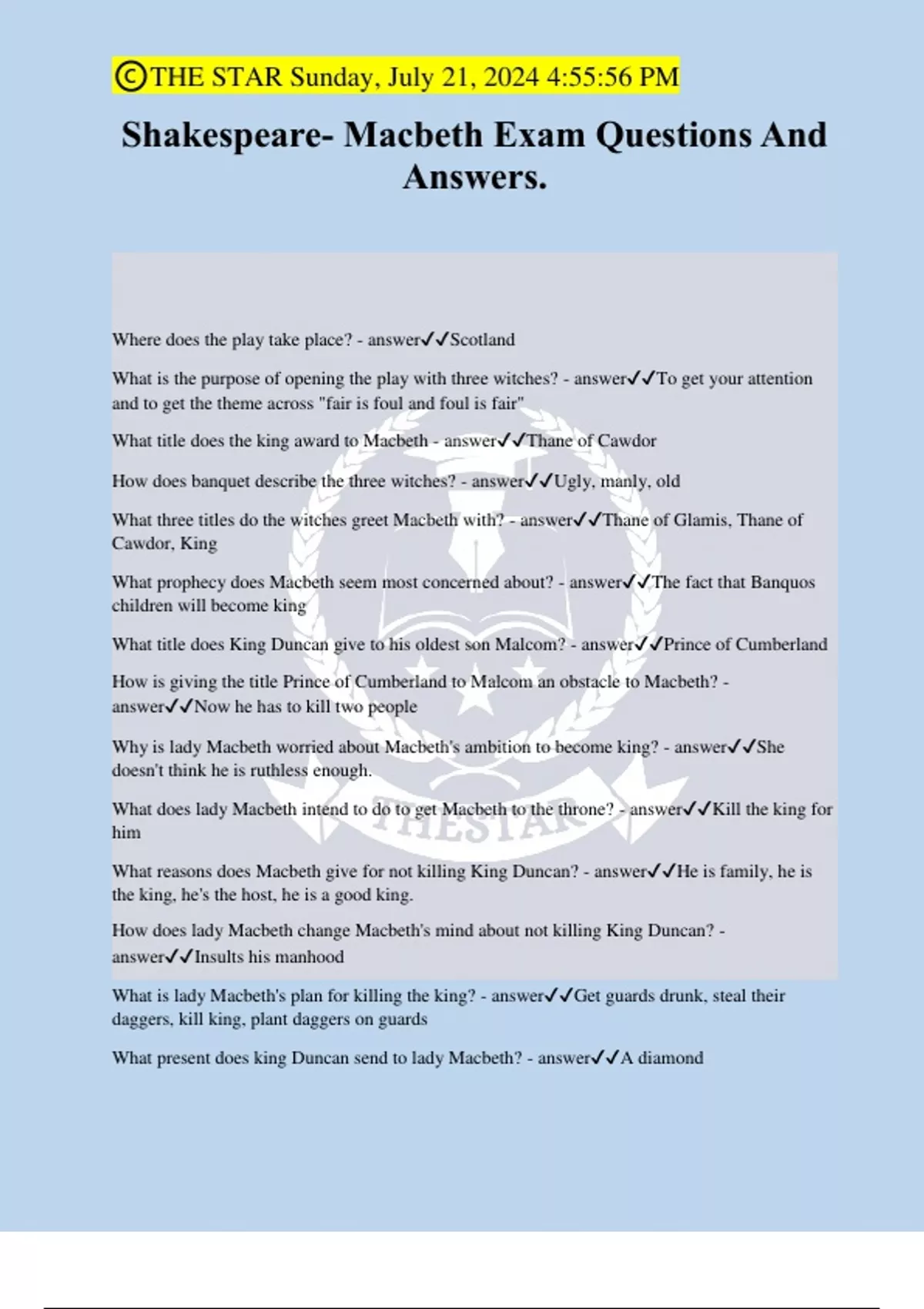 Shakespeare- Macbeth Exam Questions And Answers. Where does the play take place? - answerScotland What is the purpose of opening the play with three witches? - answerTo get your attention and to get the theme across "fair is foul and foul is fair" What title does the king award to Macbeth - answerThane of Cawdor How does banquet describe the three witches? - answerUgly, manly, old What three titles do the witches greet Macbeth with? - answerThane of Glamis, Thane of Cawdor, King What prophecy does Macbeth seem most concerned about? - answerThe fact that Banquos children will become king What title does King Duncan give to his oldest son Malcom? - answerPrince of Cumberland How is giving the title Prince of Cumberland to Malcom an obstacle to Macbeth? - answerNow he has to kill two people Why is lady Macbeth worried about Macbeth's a