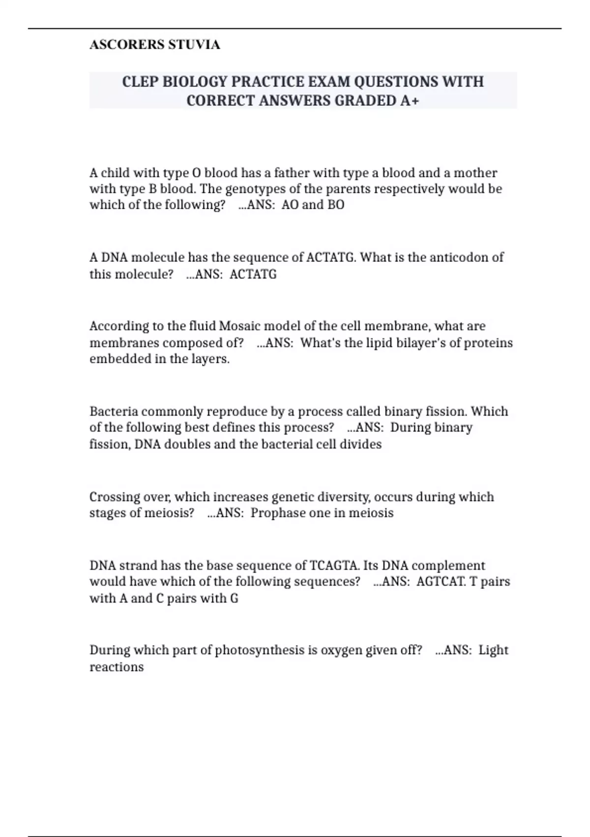 CLEP BIOLOGY PRACTICE EXAM RECENTLY UPDATED QUESTIONS WITH CORRECT ANSWERS