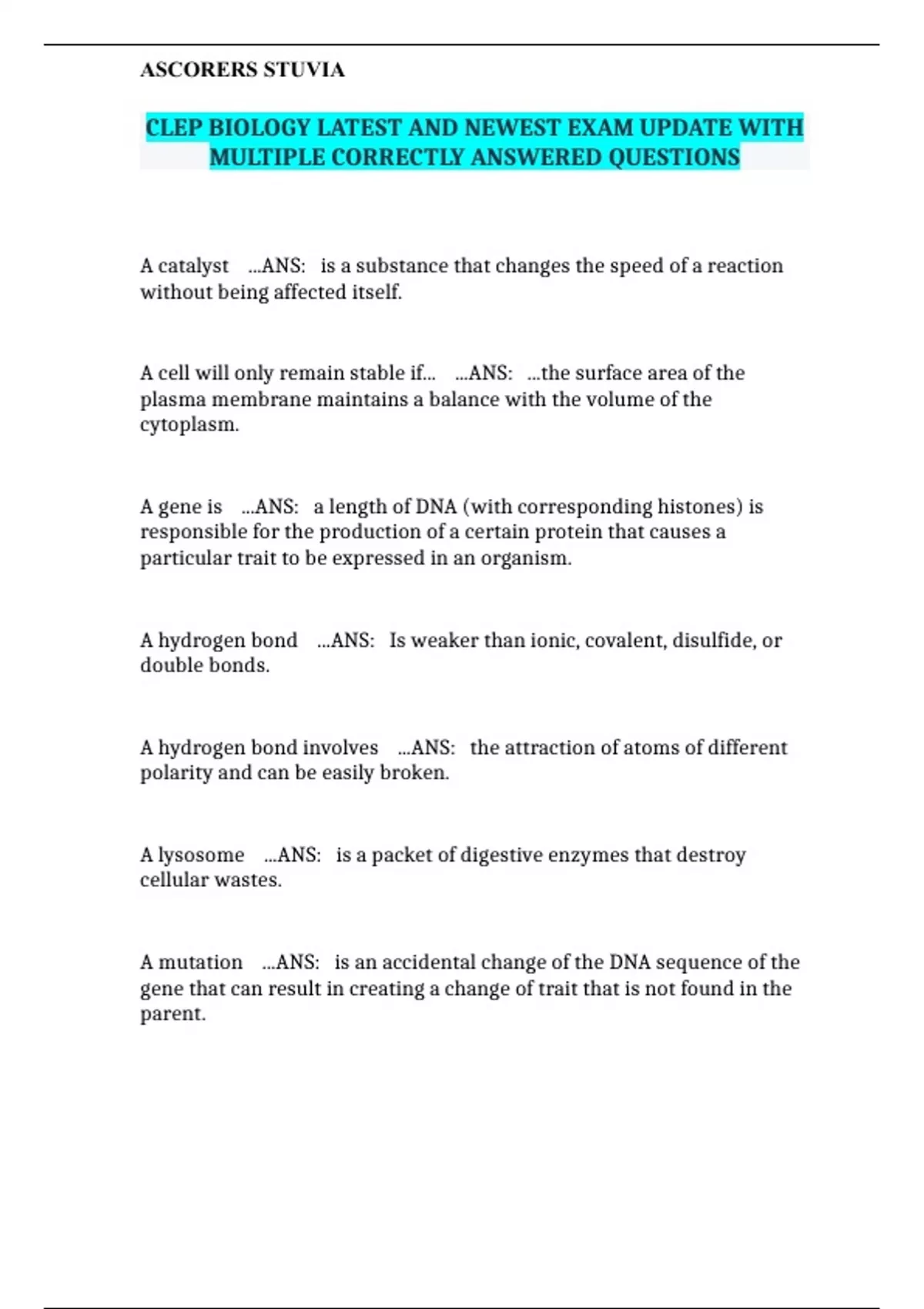CLEP BIOLOGY LATEST AND NEWEST EXAM UPDATE WITH MULTIPLE CORRECTLY ANSWERED QUESTIONS