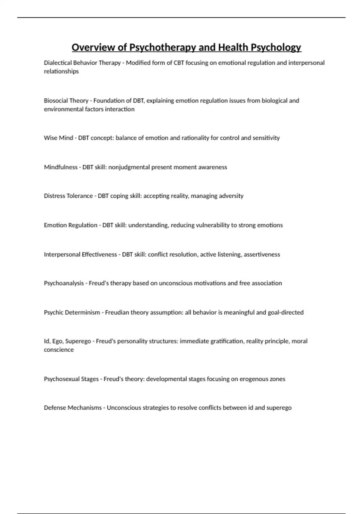 Overview of Psychotherapy and Health Psychology Dialectical Behavior Therapy - Modified form of CBT focusing on emotional regulation and interpersonal relationships Biosocial Theory - Foundation of DBT, explaining emotion regulation issues from biological and environmental factors interaction Wise Mind - DBT concept: balance of emotion and rationality for control and sensitivity Mindfulness - DBT skill: nonjudgmental present moment awareness Distress Tolerance - DBT coping skill: accepting reality, managing adversity Emotion Regulation - DBT skill: understanding, reducing vulnerability to strong emotions Interpersonal Effectiveness - DBT skill: conflict resolution, active listening, assertiveness Psychoanalysis - Freud's therapy based on unconscious motivations and free association Psychic Determinism - Freudian theory assumption: all behavior is meaningful and goal-directed Id, Ego, Superego - Freud's personality structures: immediate gratification, reality principle, moral conscience Psychosexual Stages - Freud's theory: developmental stages focusing on erogenous zones Defense Mechanisms - Unconscious strategies to resolve conflicts between id and superego Free Association - Psychoanalytic technique: clients speak freely to uncover unconscious thoughts Dream Analysis - Interpreting manifest and latent content of dreams to reveal unconscious desires Resistance - Defense mechanism against psychoanalysis, avoiding confronting unconscious thoughts Transference - Client projecting feelings onto therapist, often from past relationships Countertransference - Therapist's emotional reaction to the client, reflecting unresolved conflicts Process Stages - Steps in psychotherapy: arranging therapy, free association, transference Insight - Understanding unconscious determinants of thoughts, feelings, behaviors Separation Anxiety - Defense mechanisms making a final stand at therapy's end Contemporary Psychodynamic Therapy - Varied techniques, short-term or open-ended, focuses on affect and recurring patterns Interpersonal Relationships - Focuses on relationships and experiences between individuals Fantasy Life Exploration - Encourages exploration of uncensored thoughts, feelings, dreams Research Support - Psychoanalytic theories based on anecdotes, inconclusive treatment efficacy Interpersonal Psychotherapy (IPT) - Successful for depression and suicidal ideation Phenomenological Theory - Psychotherapy based on preserving and enhancing self-experience Self-Actualization - Fulfilling talent and potential for personal growth Growth Potential - Therapy aims for clients to accept personal worth and grow Client-Centered Therapists - Characterized by empathy, unconditional positive regard, congruence Empathy - Understanding and sensitivity to client's feelings, needs Unconditional Positive Regard - Respect, trust in client's inner potential without judgment Congruence - Therapists' genuine expression of feelings, not judgments Client-Centered Therapy - Focuses on empathy, unconditional positive regard, congruence Reflection Statements - Therapists use statements to show understanding, allowing clients to clarify thoughts Therapy Sessions - Sessions occur weekly in client-centered therapy Seven Stages - Therapy progresses through stages from self-unwillingness to self-acceptance Distress Reduction - Client-centered therapy reduces distress and enhances well-being Multicultural Sensitivity - Therapists consider clients' cultural backgrounds for effective therapy CBT Comparison - Client-centered therapy less effective than Cognitive Behavioral Therapy Family System - Interactions among family members leading to behavioral problems General Systems Theory - Views problems as failures in family communication, striving for balance Conjoint Family Therapy - Therapist sees whole family, directs communication for better understanding Concurrent Family Therapy - Therapists work individually with each family member Collaborative Family Therapy - Each family member sees different therapists who collaborate Behavioral Family Therapy - Functional analysis to identify rewards for desired behavior Cognitive-Behavioral Family Therapy - Members taught self-monitoring of problematic behaviors Multi-Systemic Therapy (MST) - For juvenile offenders, addressing multiple systems impacting behavior Multicultural Considerations - Impact on assessment, goal-setting, and interventions in therapy Couples Therapy Origin - 1920s Germany; 1930s US; 1950s became a normal service Cognitive-Behavioral Couples Therapy (CBCT) - Improves communication and problem-solving by challenging cognitions Emotion-Focused Couples Therapy (EFCT) - Improves attachment and bonding by changing interactional styles De-escalation (EFCT) - Recognizing negative patterns, emotions hindering the relationship Restructuring (EFCT) - Sharing emotions to build acceptance, compassion, and responsiveness Consolidation (EFCT) - Learning and practicing new communication strategies Enactment (EFCT) - Therapist guides emotional conversations to increase self-awareness Health Psychology Evolution - Factors influencing health and illness: biological, psychological, and social Psychosomatic Medicine - Physical conditions with psychological causes Biopsychosocial Model - Pathological behaviors influenced by multiple factors Type A Personality - Personality type prone to coronary heart disease Mind-Body Connection - Integration of psychology, behavior, and medicine Stressor - Event triggering stress response Transactional Model of Stress - Stress affects hormonal, autonomic, and immune systems Epinephrine - Adrenaline hormone released during stress Psychoneuroimmunology (PNI) - Study of stress impact on body systems and behavior Protection Motivation Theory (PMT) - Behavior influenced by threat and coping appraisals Social Support - Relationship quality shielding from stress effects Biofeedback - Monitoring and modifying physiological functions Operant Conditioning - Using reinf