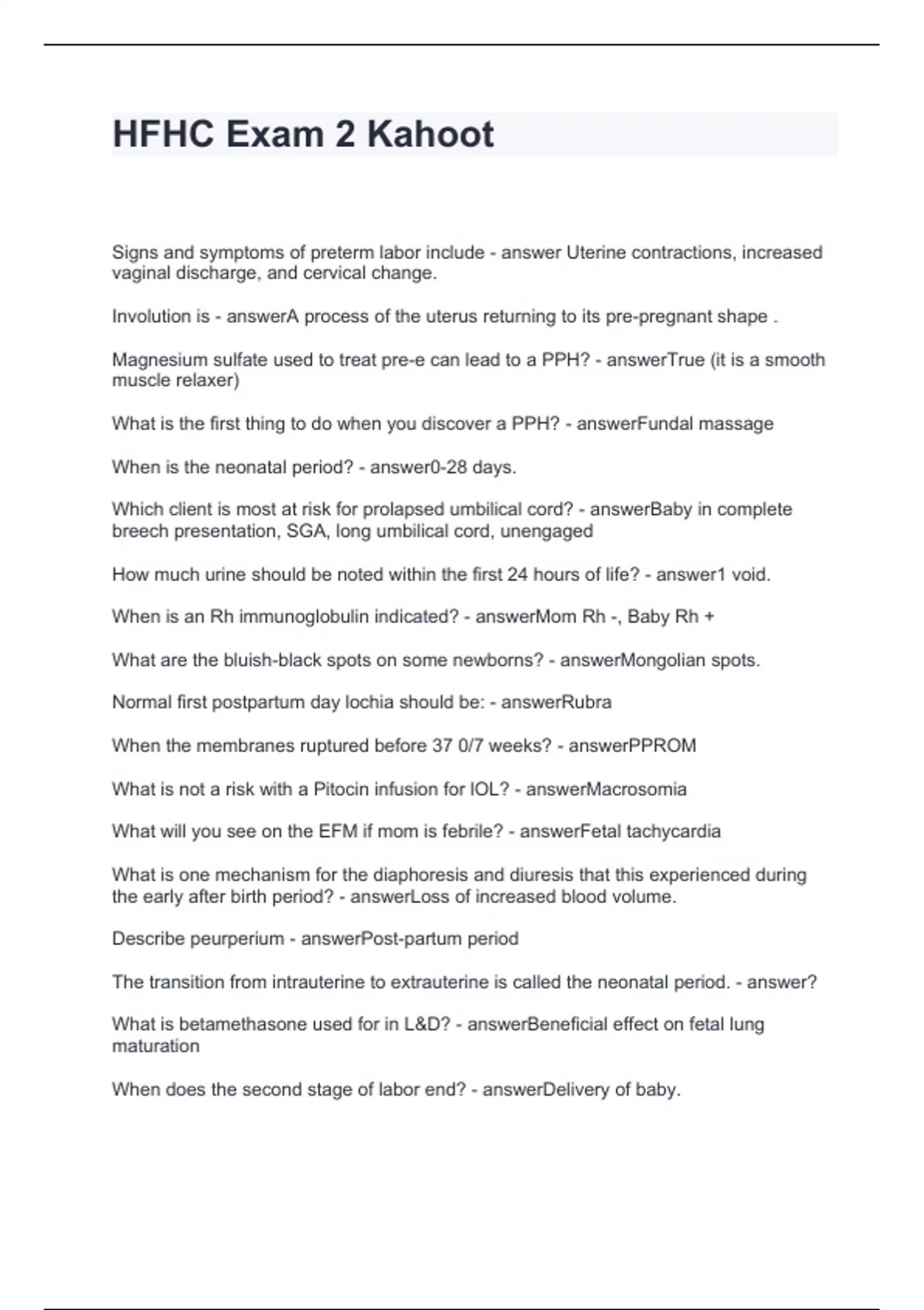 Exam of 2 pages for the course HFHC at HFHC (HFHC Exam 2 Kahoot)