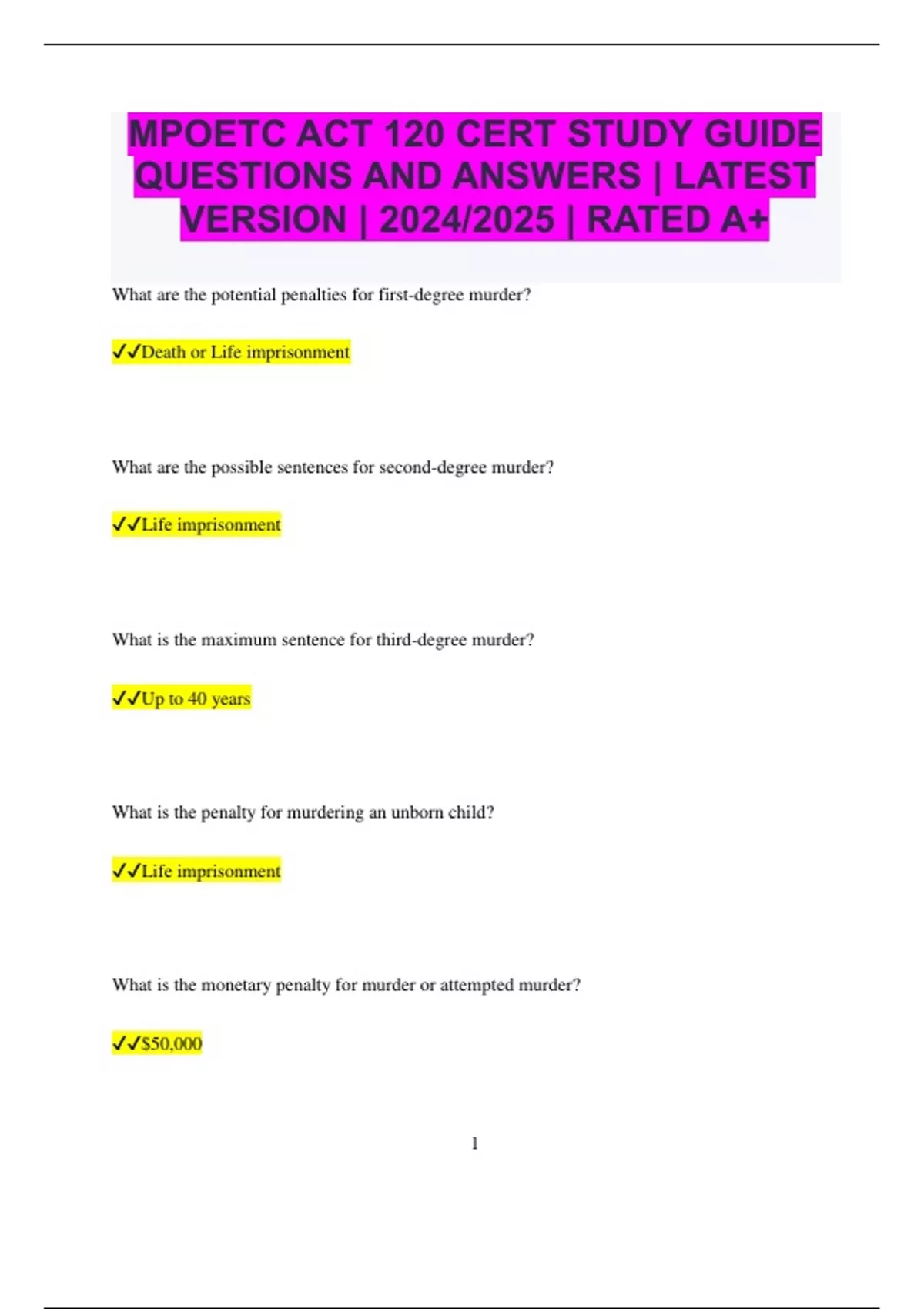 MPOETC ACT 120 CERT STUDY GUIDE QUESTIONS AND ANSWERS | LATEST VERSION | 2024/2025 | RATED A+ What are the potential penalties for first-degree murder? Death or Life imprisonment What are the possible sentences for second-degree murder? Life imprisonment What is the maximum sentence for third-degree murder? Up to 40 years What is the penalty for murdering an unborn child? Life imprisonment What is the monetary penalty for murder or attempted murder? $50,000 2 What are the fines and maximum sentences for a first-degree felony? $25,000 and up to 20 years in prison What are the fines and maximum sentences for a second-degree felony? $25,000 and up to 10 years in prison What are the fines and maximum sentences for a third-degree felony? $15,000 and up to 7 years in prison What are the fines and maximum sentences for a first-degree misdemeanor? $10,000 and up to 5 years in prison What are the fines and maximum sentences for a second-degree misdemeanor? $5,000 and up to 2 years in prison What are the fines and maximum sentences for a third-degree misdemeanor? $2,500 and up to 1 year in prison 3 What are the fines and maximum sentences for a summary offense? $300 and up to 90 days in jail What does the Bill of Rights refer to? The first 10 amendments to the U.S. Constitution What freedoms does the First Amendment guarantee? Freedom of religion, speech, press, assembly, and petition What right is protected by the Second Amendment? The right to possess and carry firearms What does the Third Amendment