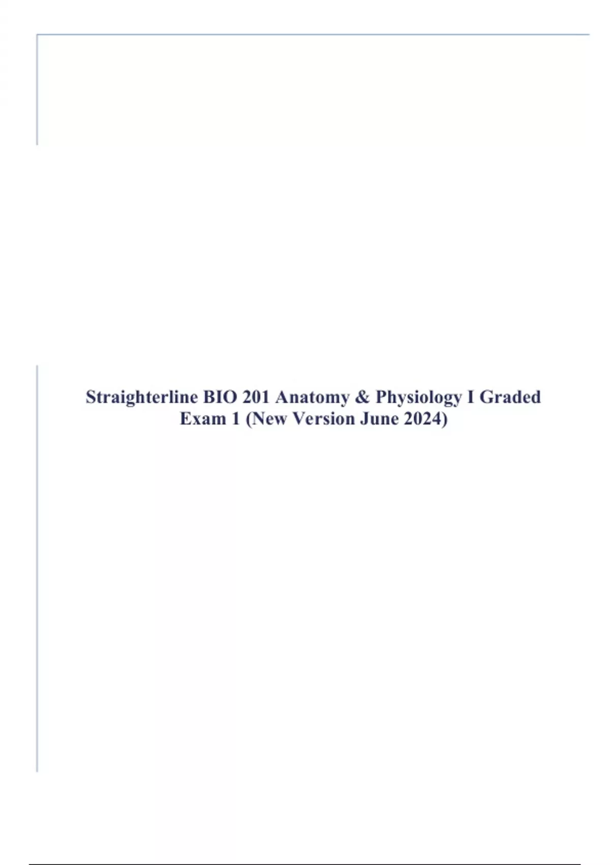 Straighterline BIO 201 Anatomy & Physiology I Graded Exam 1 (New Version June 2024) We are a team of experts offering class attendance for all Straighterline, Online ATI, HESI, NCLEX, Portage Learning, Sophia etc courses (including final proctored exams!!). We also write essays, discussion posts, research papers and school assignments. Should you need any of these services, Contact us via email: or : +1 (540) 753-5914. Guaranteed Passing! BIO201_MH_V4 Topic 4: Genetics Question 1 Correct 5.00 points out of 5.00 Flag question Question text Which subdivision of anatomy involves the study of organs that function together? Select one: a. Histology b. Regional c. Developmental d. Systemic e. Surface anatomy Question 2 Correct 5.00 points out of 5.00 Flag question Question text The antebrachial region is the Select one:a. area in front of the elbow. b. lower back. c. forearm. d. bottom of foot. e. chest area. Question 3 Correct 5.00 points out of 5.00 Flag question Question text A major limitation of radiographs is that they Select one: a. have very few applications. b. are old technology that do not give good results. c. give only a flat, two-dimensional image of the body. d. can only visualize bone. Question 4 Correct 5.00 points out of 5.00 Flag question Question text In a negative feedback mechanism, the response of the effector Select one: a. enhances the original stimulus. b. reverses the original stimulus. c. creates a cycle that leads away from homeostasis. d. is usually damaging to the body. e. has no effect on the original stimulus.Question 5 Correct 5.00 points out of 5.00 Flag question Question text An example of a structure contained by the mediastinum is the_________. Select one: a. stomach b. sternum c. esophagus d. lung e. brain Question 6 Incorrect 0.00 points out of 5.00 Flag question Question text Which of the following is not a term that describes a cut that separates the body into left and right portions? Select one: a. Coronal b. Median c. Parasagittal d. Sagittal Question 7 Correct 5.00 points out of 5.00Flag question Question text Which of the following is a proton donor? Select one: a. A base b. A salt c. Glucose d. A neutral substance e. An acid Question 8 Correct 5.00 points out of 5.00 Flag question Question text Triglycerides are composed of Select one: a. glycerol and fatty acids. b. amino acids. c. monosaccharides. d. None of the choices are correct. e. nucleotides. Question 9 Correct 5.00 points out of 5.00 Flag questionQuestion text To which of the following organic groups does an enzyme belong? Select one: a. Nucleic acid b. Vitamin c. Lipid d. Protein e. Carbohydrate Question 10 Correct 5.00 points out of 5.00 Flag question Question text Why are cyanide compounds lethal to humans? Select one: a. All of the choices are correct. b. They interfere with nerve impulses. c. They interfere with protein synthesis. d. They interfere with the production of ATP. e. They interfere with muscle contraction. Question 11 Correct 5.00 points out of 5.00 Flag question Question text Glycogen is the Select one: a. sugar found in RNA.b. storage carbohydrate in animals. c. storage carbohydrate in plants. d. major nutrient for most body cells. e. nondigestible plant polysaccharide. Question 12 Correct 5.00 points out of 5.00 Flag question Question text Which molecule is produced as a waste product of the metabolism of glucose by cells? Select one: a. Oxygen b. Nitrogen c. Carbon dioxide d. Carbon monoxide e. Water Question 13 Correct 5.00 points out of 5.00 Flag question Question text According to the most current model of the plasma membrane, Select one: a. phospholipids and cholesterol form a single lipid bilayer. b. the membrane is a rigid unchanging structure. c. cholesterol forms the innermost layer of the membrane. d. the membrane is impermeable to all other molecules. e. proteins are free to move about within a double layer of phospholipids.Question 14 Correct 5.00 points out of 5.00 Flag question Question text The cytoskeleton consists of Select one: a. microfilaments, mitochondria, and lipochromes. b. microtubules, actin filaments, and intermediate filaments. c. actin filaments, mitochondria, and intermediate filaments. d. ribosomes, the nucleus, and the Golgi apparatus. e. lipochromes, microfilaments, and microtubules. Question 15 Correct 5.00 points out of 5.00 Flag question Question text Active transport Select one: a. can move substances along their concentration gradient. b. does not require metabolic energy (ATP). c. follows osmotic pressure gradients. d. requires ATP. e. involves vesicle formation. Question 16 Correct 5.00 points out of 5.00Flag question Question text The movement of a substance from an area of high concentration to an area of lower concentration is called_________. Select one: a. active transport b. diffusion c. osmosis d. facilitated diffusion e. endocytosis Question 17 Correct 5.00 points out of 5.00 Flag question Question text Which of the following activities is associated with lysosomes? Select one: a. Endocytosis b. Destruction of nonfunctional organelles c. Intracellular support d. Exocytosis e. Energy production Question 18 Correct 5.00 points out of 5.00 Flag questionQuestion text A symporter will transport_________ across the plasma membrane. Select one: a. two of the same ions or molecules in the same direction b. two different ions or molecules in opposite directions c. two different ions or molecules in the same direction d. two of the same ions or molecules in opposite directions e. one specific ion or molecule Question 19 Incorrect 0.00 points out of 5.00 Flag question Question text In general, water-soluble molecules diffuse through the_________; and lipid-soluble molecules diffuse through the_________. Select one: a. None of the choices are correct. b. lipid bilayer; lipid bilayer c. membrane channels; lipid bilayer d. membrane channels; membrane channels e. lipid bilayer; membrane channels Question 20 Correct 5.00 points out of 5.