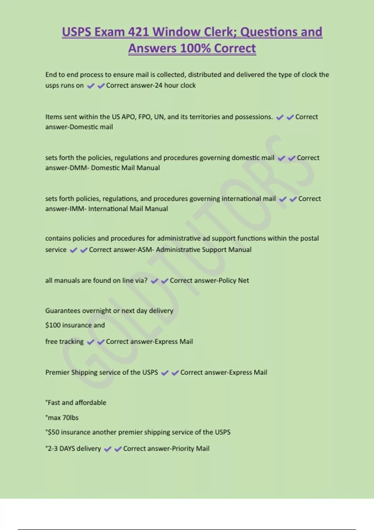 USPS Exam 421 Window Clerk; Questions and Answers 100% Correct End to end process to ensure mail is collected, distributed and delivered the type of clock the usps runs on Correct answer-24 hour clock Items sent within the US APO, FPO, UN, and its territories and possessions. Correct answer-Domestic mail sets forth the policies, regulations and procedures governing domestic mail Correct answer-DMM- Domestic Mail Manual sets forth policies, regulations, and procedures governing international mail Correct answer-IMM- International Mail Manual