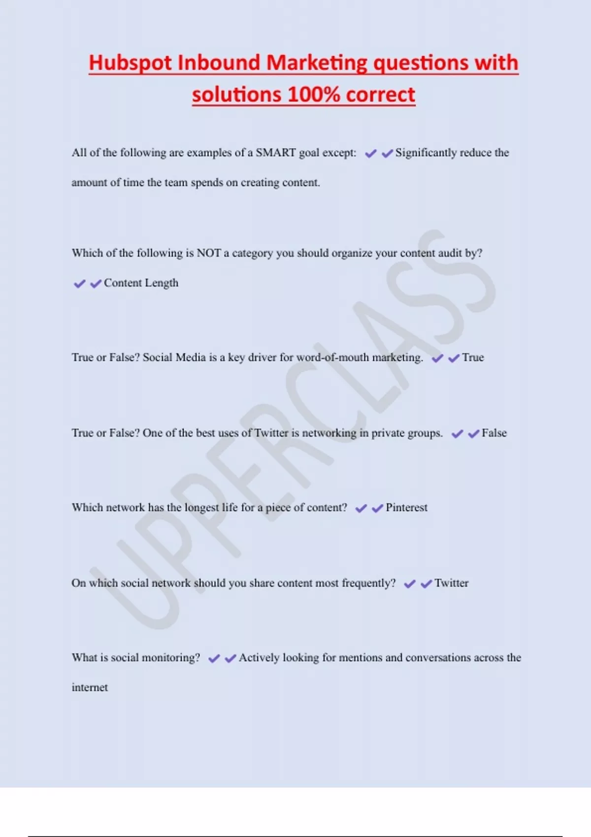 Hubspot Inbound Marketing questions with solutions 100% correct All of the following are examples of a SMART goal except: Significantly reduce the amount of time the team spends on creating content. Which of the following is NOT a category you should organize your content audit by? Content Length True or False? Social Media is a key driver for word-of-mouth marketing. True True or False? One of the best uses of Twitter is networking in private groups. False Which network has the longest life for a piece of content? Pinterest