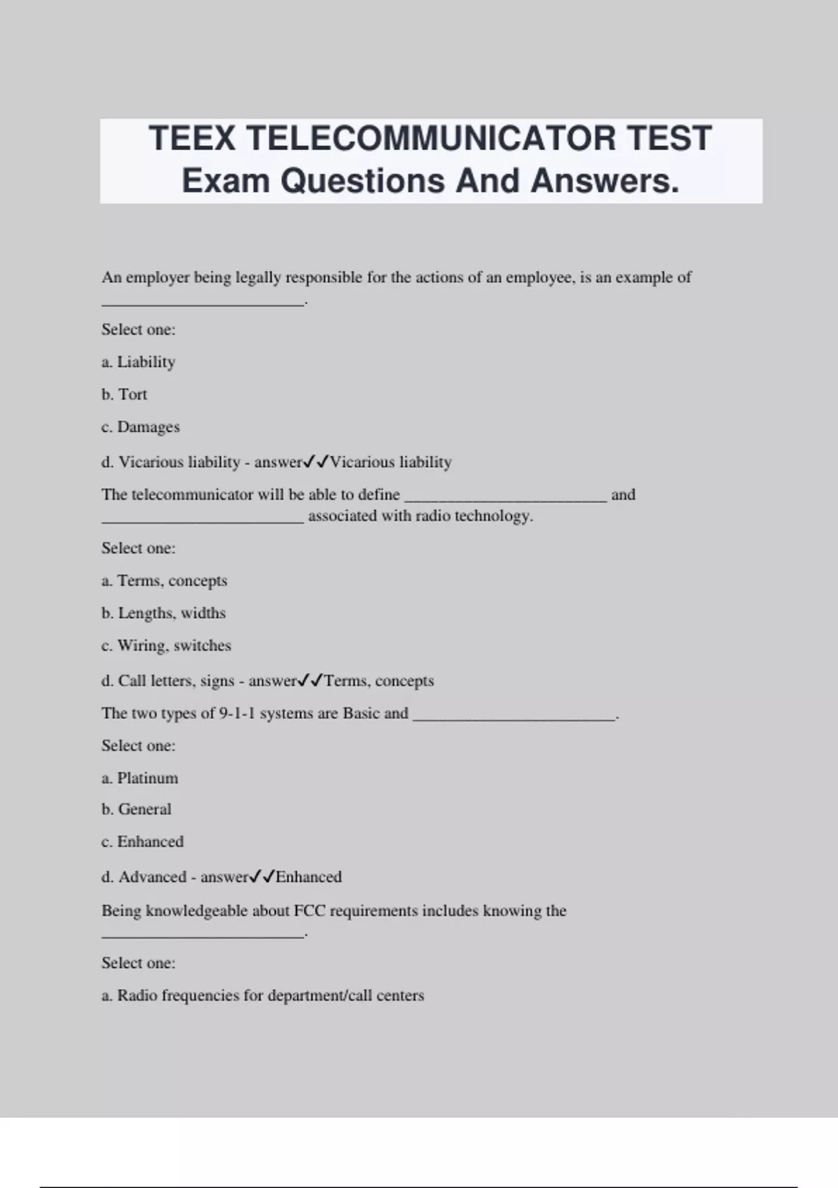 TEEX TELECOMMUNICATOR TEST Exam Questions And Answers. An employer being legally responsible for the actions of an employee, is an example of ________________________. Select one: a. Liability b. Tort c. Damages d. Vicarious liability - answerVicarious liability The telecommunicator will be able to define ________________________ and ________________________ associated with radio technology. Select one: a. Terms, concepts b. Lengths, widths c. Wiring, switches d. Call letters, signs - answerTerms, concepts The two types of 9-1-1 systems are Basic and ________________________. Select one: a. Platinum b. General c. Enhanced d. Advanced - answerEnhanced Being knowledgeable about FCC requirements includes knowing the ________________________. Select one: a. Radio frequencies for department/call centers b. Call letters for all radio stations west of the Mississippi c. Manufacturer of all radio equipment d. Expiration date on the radio equipment warranties - answerRadio frequencies for department/call centers There are two types of causation; cause in fact and ________________________. Select one: a. Cause in opinion b. Cause in action c. Cause in tort d. Cause in damages - answerCause in action _____________________ is failure to do what a reasonable person would do' or exercise the level of care required by law. Select one: a. Tort b. Public Duty Doctrine c. Negligence d. Liability - answerNegligence A dispatcher or other communication specialist appointed under or governed by the provisions of the occupation code 1701.45. The first-first responder. - answerTelecommunicator Occurence of imminent threat of damage, injury or loss of life or property resulting from an extraordinary natural or man-made cause. ______ demand immediate reaction. - answerEmergency Any system which electric or electromagnetic signals are used to transmit information. Systems including radio, light or waves; wire or cable; et. A process by which information is exchanged between individuals through a common system of symbols, signs, or behavior. - answerCommunication Roles of a Telecommunicator are; 911 call taker, fire dispatcher, police dispatcher, ems dispatcher. True/False - answerTrue 3 entities the telecommunicator has a working relationship with: - answerThe public, responders, other agencies Discipline dealing with what is good and bad. A moral duty and obligation. A set of rules and standards that govern individual conduct. - answerEthics An occupation which one ______ to be skilled in. A vocation or occupation requiring advanced training. - answerProfession As a public servant, you are not expected to abide by standards of conduct and regulations established by the Texas Legislature, the federal government, local ordinances, and departmental policy. True/False - answerFalse What is a trust to be used only to advance public interests, not personal gain? - answerPublic Interest Decisions made on the merits, free of partiality or prejudice and unimpeded by personal bias. - answerObjective Judgment Government is to be conducted openly, efficiently, suitably and honorably so the public can make informed judgments and hold public officials ____________. - answerAccountability Honor and respect _________ principles; observe letter and spirit laws. - answerDemocracy It is not necessary to be familiar with your jurisdiction's geography.True/False - answerFalse Callers will know where they are everytime they call dispatch. True/False - answerFalse If you're not sure something is confidential you should refer to your __________ or your _________________. - answerPolicies, Procedures There are Federal laws encompassing TCIC/NCIC confidentiality. True/False - answerTrue It is not acceptable to check people on TCIC/NCIC for personal reasons but it is ok to check them through agency databases. True/False - answerFalse If an officer requests a copy of a 9-1-1 call they should be referred to a dispatch supervisor. True/False - answerTrue Social media pages are private and you do not have to give your agency access to them. True/False - answerFalse A feature corresponding to automatic number identification by which the number provided by the automatic number identification feature is matched with the address or location of the telephone from which the call is made and is presented to the public safety answering point along with the number in a computerized 9-1-1 system. - answerALI (automatic location identification) The feature provided with computerized 9-1-1 s