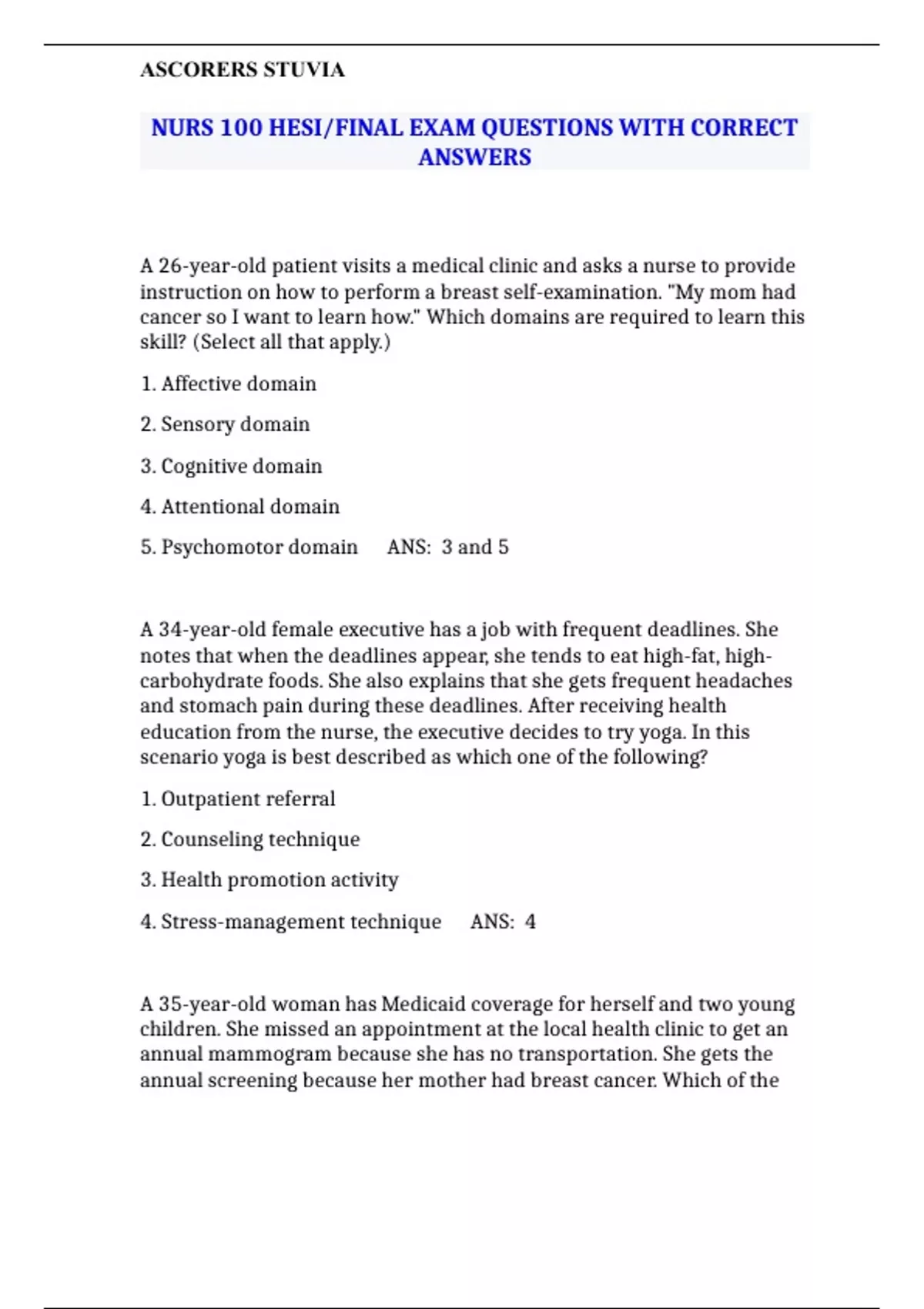 NURS 100 HESI/FINAL EXAM QUESTIONS WITH CORRECT ANSWERS NURS 100 HESI/FINAL EXAM QUESTIONS WITH CORRECT ANSWERS