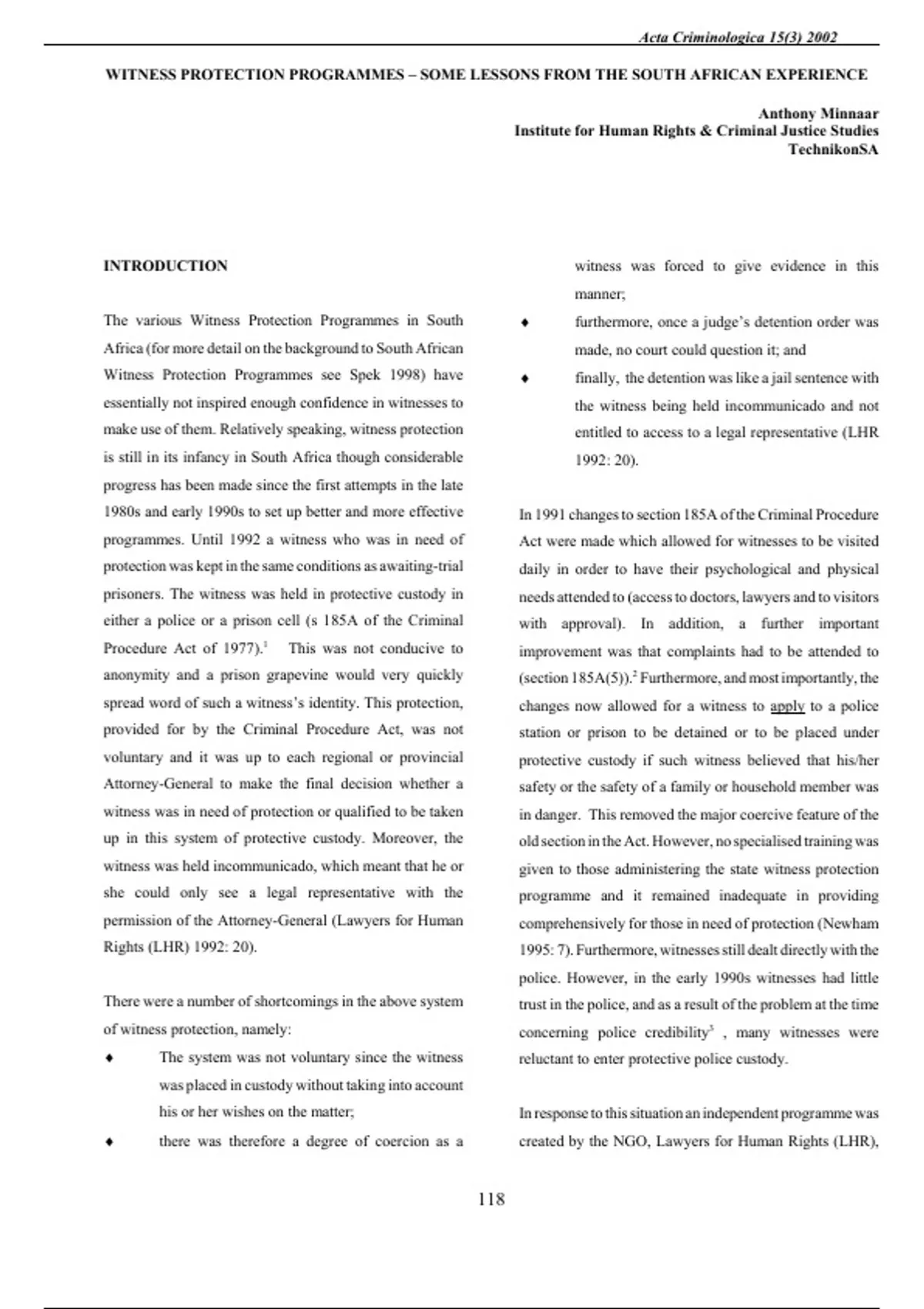 The various Witness Protection Programmes in South Africa (for more detail on the background to South African Witness Protection Programmes see Spek 1998) have essentially not inspired enough confidence in witnesses to make use of them. Relatively speaking, witness protection is still in its infancy in South Africa though considerable progress has been made since the first attempts in the late 1980s and early 1990s to set up better and more effective programmes. Until 1992 a witness who was in need of protection was kept in the same conditions as awaiting-trial prisoners. The witness was held in protective custody in either a police or a prison cell (s 185A of the Criminal Procedure Act of 1977).1 This was not conducive to anonymity and a prison grapevine would very quickly spread word of such a witness’s identity. This protection, provided for by the Criminal Procedure Act, was not voluntary and it was up to each regional or provincial Attorney-General to make the final decision whether a witness was in need of protection or qualified to be taken up in this system of protective custody. Moreover, the witness was held incommunicado, which meant that he or she could only see a legal representative with the permission of the Attorney-General (Lawyers for Human Rights (LHR) 1992: 20). There were a number of shortcomings in the above system of witness protection, namely: The system was not voluntary since the witness was placed in custody without taking into account his or her wishes on the matter; there was therefore a degree of coercion as a witness was forced to give evidence in this manner; furthermore, once a judge’s detention order was made, no court could question it; and finally, the detention was like a jail sentence with the witness being held incommunicado and not entitled to access to a legal representative (LHR 1992: 20). In 1991 changes to section 185A of the Criminal Procedure Act were made which allowed for witnesses to be visited daily in order to have their psychological and physical needs attended to (access to doctors, lawyers and to visitors with approval). In addition, a further important improvement was that complaints had to be attended to (section 185A(5)).2 Furthermore, and most importantly, the changes now allowed for a witness to apply to a police station or prison to be detained or to be placed under protective custody if such witness believed that his/her safety or the safety of a family or household member was in danger. This removed the major coercive feature of the old section in the Act. However, no specialised training was given to those administering the state witness protection programme and it remained inadequate in providing comprehensively for those in need of protection (Newham 1995: 7). Furthermore, witnesses still dealt directly with the police. However, in the early 1990s witnesses had little trust in the police, and as a result of the problem at the time concerning police credibility3 , many witnesses were reluctant to enter protective police custody. In response to this situation an independent programme was created by the NGO, Lawyers for Human Rights (LHR), Acta Criminologica 15(3) 2002 119 who set up their own witness protection programme in May 1992. They had realised that there was a need for an independent witness protection programme. They began by offering witnesses access to safe places or houses and making this known publicly and through the network of law clinics countrywide. LHR, however, made a distinction, i.e. with regard to the level of protection and safekeeping offered, between people on the basis of whether the particular person was only in possession of hearsay evidence, or was an eyewitness, a perpetrator turned state witness or an informer in a life-threatening situation. However, there were no other special guidelines or conditions for acceptance of a person onto the LHR programme. Each case would be reviewed separately. If accepted onto the LHR programme, a witness would be placed either in a hotel or with a support family if possible. At the time LHR received a good deal of assistance and help from other organisations like church groups and activist human rights organisations like Peace Action. Unfortunately the LHR programme suffered from inadequate financial support, had no long-term plan, while the LHR members running the programme never received any proper training or professional assistance in witness protection (LHR 1992: 28; Spek 1998: 4). Other problems encountered by the LHR programme included the following: ¾ The initial use of hotel accommodation for witnesses proved to be a costly exercise, especially if families of witnesses also applied for protection. ¾ Ensuring proper security posed serious problems. ¾ Witnesses were often conspicuous because of their clothing, youthfulness or demeanour. ¾ No resources were available for the provision of social welfare, therapy and counselling services (LHR 1992: 26-27). One of the most problematic aspects of the LHR programme was the contentious issue of relocation. Many witnesses were extremely reluctant to relocate in areas away from their home, town or area of residence (LHR 1992: 27). With the high levels of political violence in the early 1990s new legislation was passed which inter alia made provision for other conditions for a witness to receive protection. This legislation, The Prevention of Public Violence and Intimidation Act 139 of 1991, which set up the so-called Goldstone Commission under the chairmanship of Judge Richard Goldstone, allowed for a witness to voluntarily withdraw from the programme. The Commission initially d