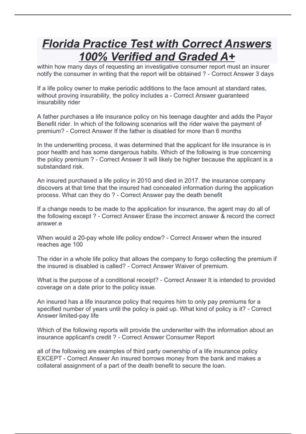Florida Practice Test with Correct Answers 100% Verified and Graded A+ within how many days of requesting an investigative consumer report must an insurer notify the consumer in writing that the report will be obtained ? - Correct Answer 3 days If a life policy owner to make periodic additions to the face amount at standard rates, without proving insurability, the policy includes a - Correct Answer guaranteed insurability rider A father purchases a life insurance policy on his teenage daughter and adds the Payor Benefit rider. In which of the following scenarios will the rider waive the payment of premium? - Correct Answer If the father is disabled for more than 6 months In the underwriting process, it was determined that the applicant for life insurance is in poor health and has some dangerous habits. Which of the following is true concerning the policy premium ? - Correct Answer It will likely be higher because the applicant is a substandard risk. An insured purchased a life policy in 2010 and died in 2017. the insurance company discovers at that time that the insured had concealed information during the application process. What can they do ? - Correct Answer pay the death benefit If a change needs to be made to the application for insurance, the agent may do all of the following except ? - Correct Answer Erase the incorrect answer & record the correct answer.e When would a 20-pay whole life policy endow? - Correct Answer when the insured reaches age 100 The rider in a whole life policy that allows the company to forgo collecting the premium if the insured is disabled is called? - Correct Answer Waiver of premium. What is the purpose of a conditional receipt? - Correct Answer It is intended to provided coverage on a date prior to the policy issue. An insured has a life insurance policy that requires him to only pay premiums for a specified number of years until the policy is paid up. What kind of policy is it? - Correct Answer limited-pay life Which of the following reports will provide the underwriter with the information about an insurance applicant's credit ? - Correct Answer Consumer Report all of the following are examples of third party ownership of a life insurance policy EXCEPT - Correct Answer An insured borrows money from the bank and makes a collateral assignment of a part of the death benefit to secure the loan.