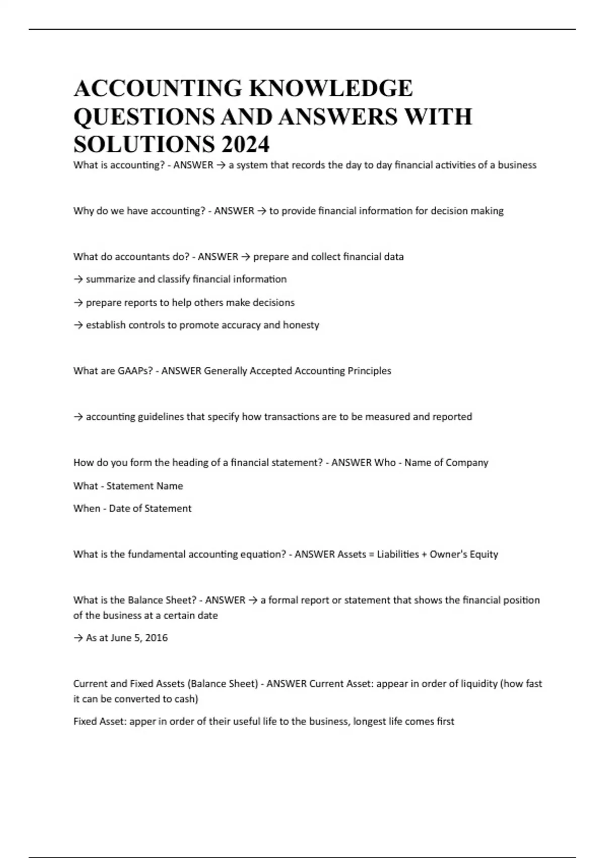ACCOUNTING KNOWLEDGE QUESTIONS AND ANSWERS WITH SOLUTIONS 2024
