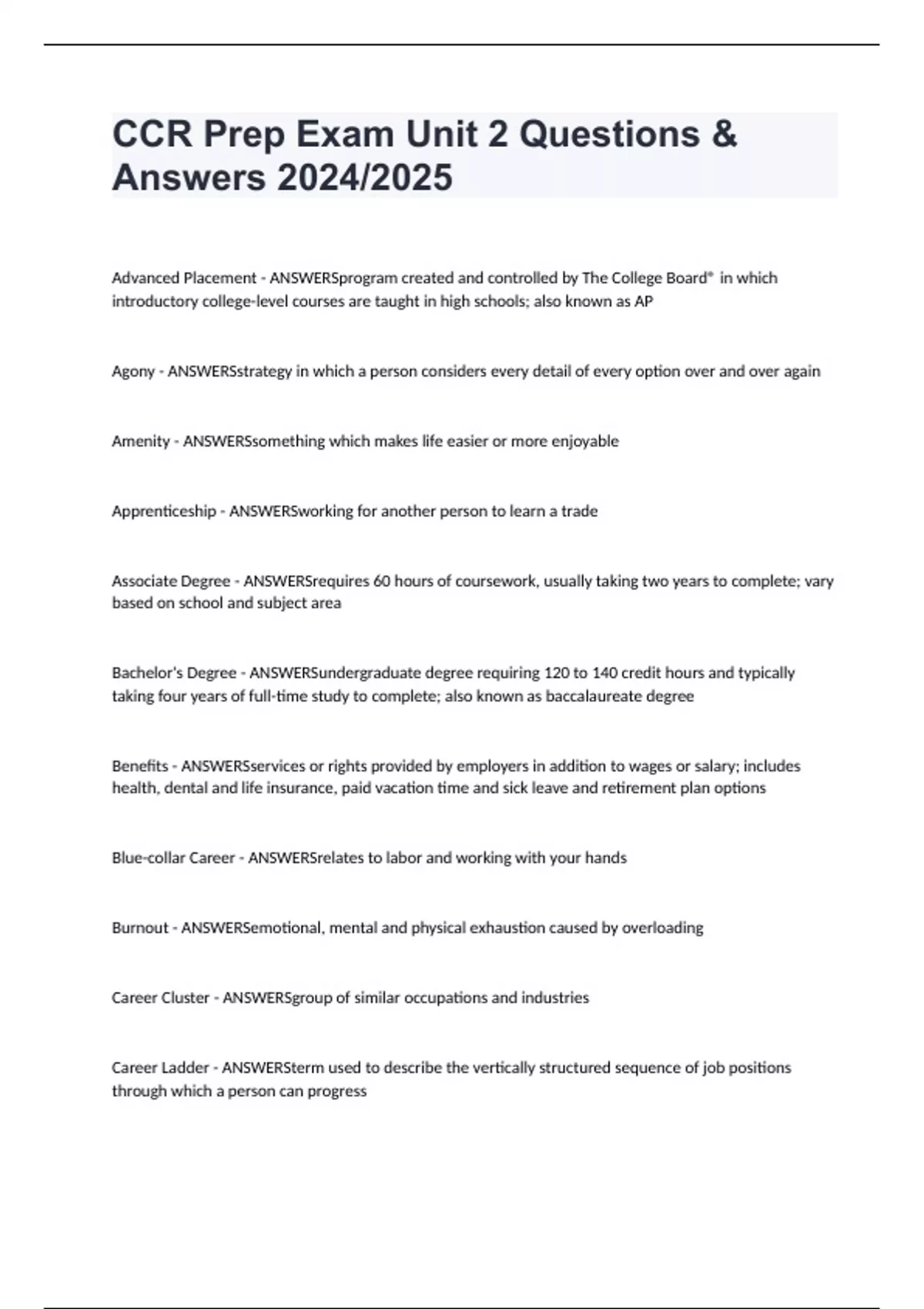CCR Prep Exam Unit 2 Questions & Answers 2024/2025 Advanced Placement - ANSWERSprogram created and controlled by The College Board® in which introductory college-level courses are taught in high schools; also known as AP Agony - ANSWERSstrategy in which a person considers every detail of every option over and over again Amenity - ANSWERSsomething which makes life easier or more enjoyable Apprenticeship - ANSWERSworking for another person to learn a trade Associate Degree - ANSWERSrequires 60 hours of coursework, usually taking two years to complete; vary based on school and subject area Bachelor's Degree - ANSWERSundergraduate degree requiring 120 to 140 credit hours and typically taking four years of full-time study to complete; also known as baccalaureate degree Benefits - ANSWERSservices or rights provided by employers in addition to wages or salary; includes health, dental and life insurance, paid vacation time and sick leave and retirement plan options Blue-collar Career - ANSWERSrelates to labor and working with your hands Burnout - ANSWERSemotional, mental and physical exhaustion caused by overloading Career Cluster - ANSWERSgroup of similar occupations and industries Career Ladder - ANSWERSterm used to describe the vertically structured sequence of job positions through which a person can progress