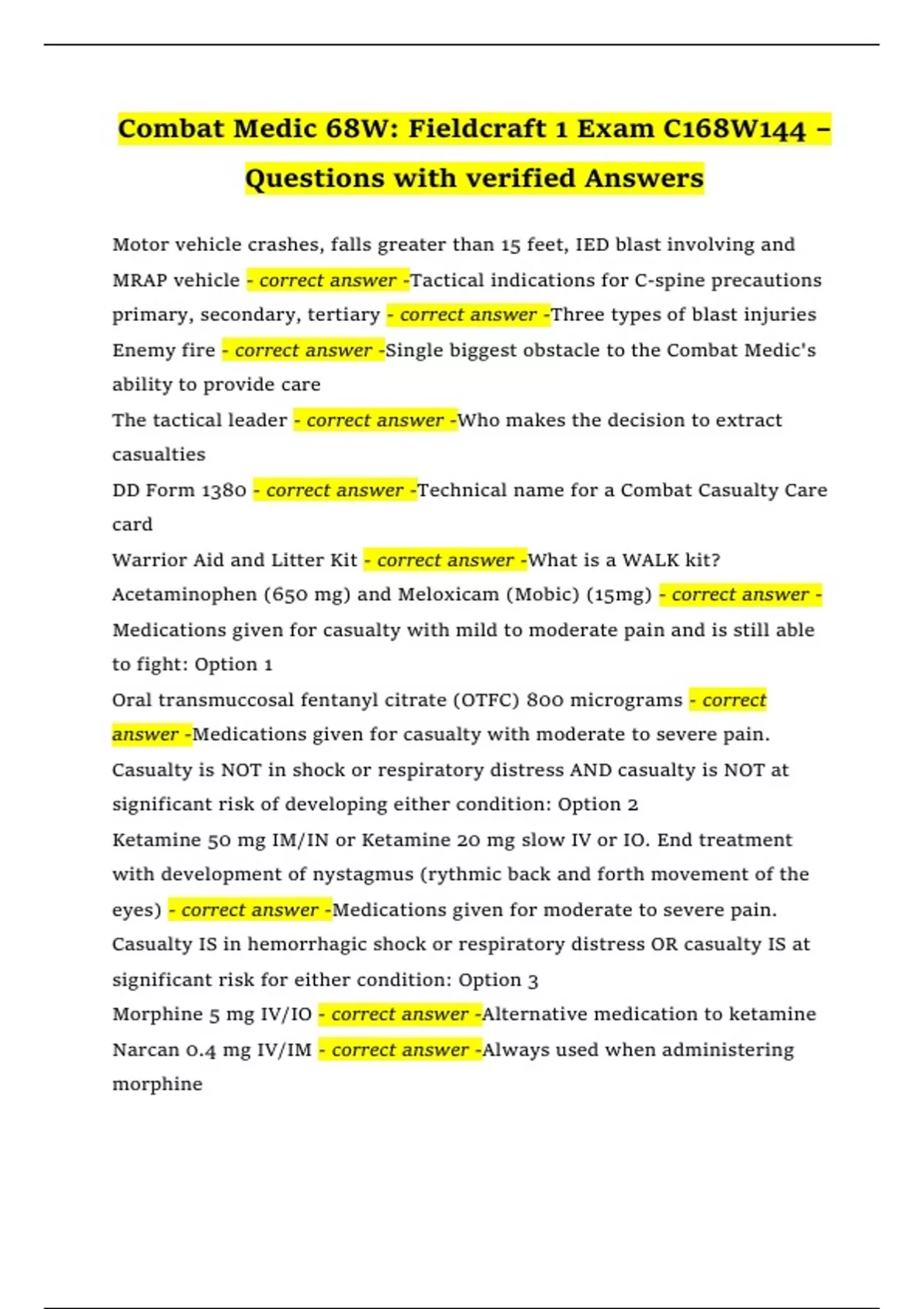 Combat Medic 68W: Fieldcraft 1 Exam C168W144 – Questions with verified Answers
