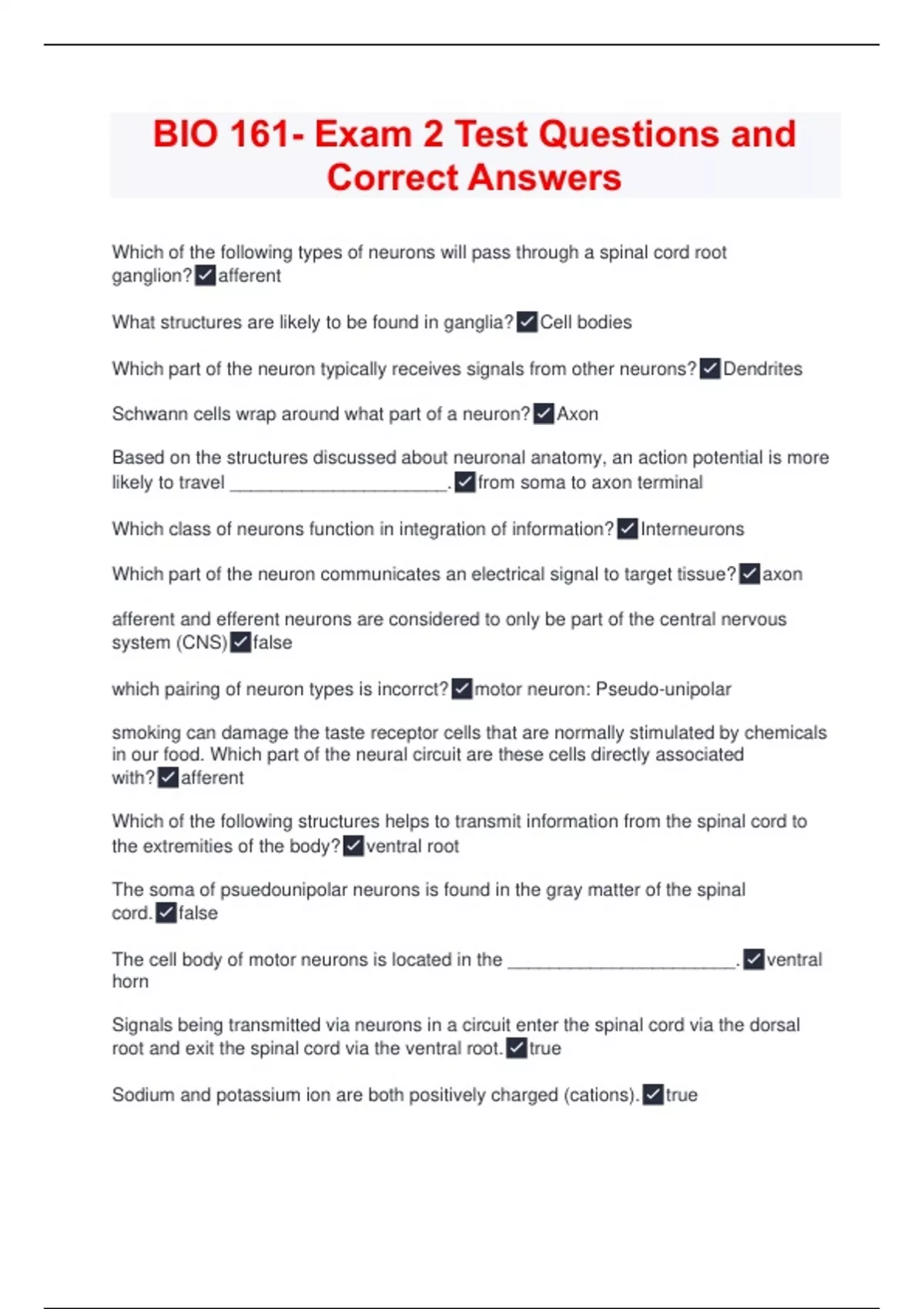 Which of the following types of neurons will pass through a spinal cord root ganglion?afferent What structures are likely to be found in ganglia?Cell bodies Which part of the neuron typically receives signals from other neurons?Dendrites Schwann cells wrap around what part of a neuron?Axon Based on the structures discussed about neuronal anatomy, an action potential is more likely to travel _____________________.from soma to axon terminal Which class of neurons function in integration of information?Interneurons Which part of the neuron communicates an electrical signal to target tissue?axon afferent and efferent neurons are considered to only be part of the central nervous system (CNS)false which pairing of neuron types is incorrct?motor neuron: Pseudo-unipolar smoking can damage the taste receptor cells that are normally stimulated by chemicals in our food. Which part of the neural circuit are these cells directly associated with?afferent Which of the following structures helps to transmit information from the spinal cord to the extremities of the body?ventral root The soma of psuedounipolar neurons is found in the gray matter of the spinal cord.false The cell body of motor neurons is located in the ______________________.ventral horn Signals being transmitted via neurons in a circuit enter the spinal cord via the dorsal root and exit the spinal cord via the ventral root.true Sodium and potassium ion are both positively charged (cations).true