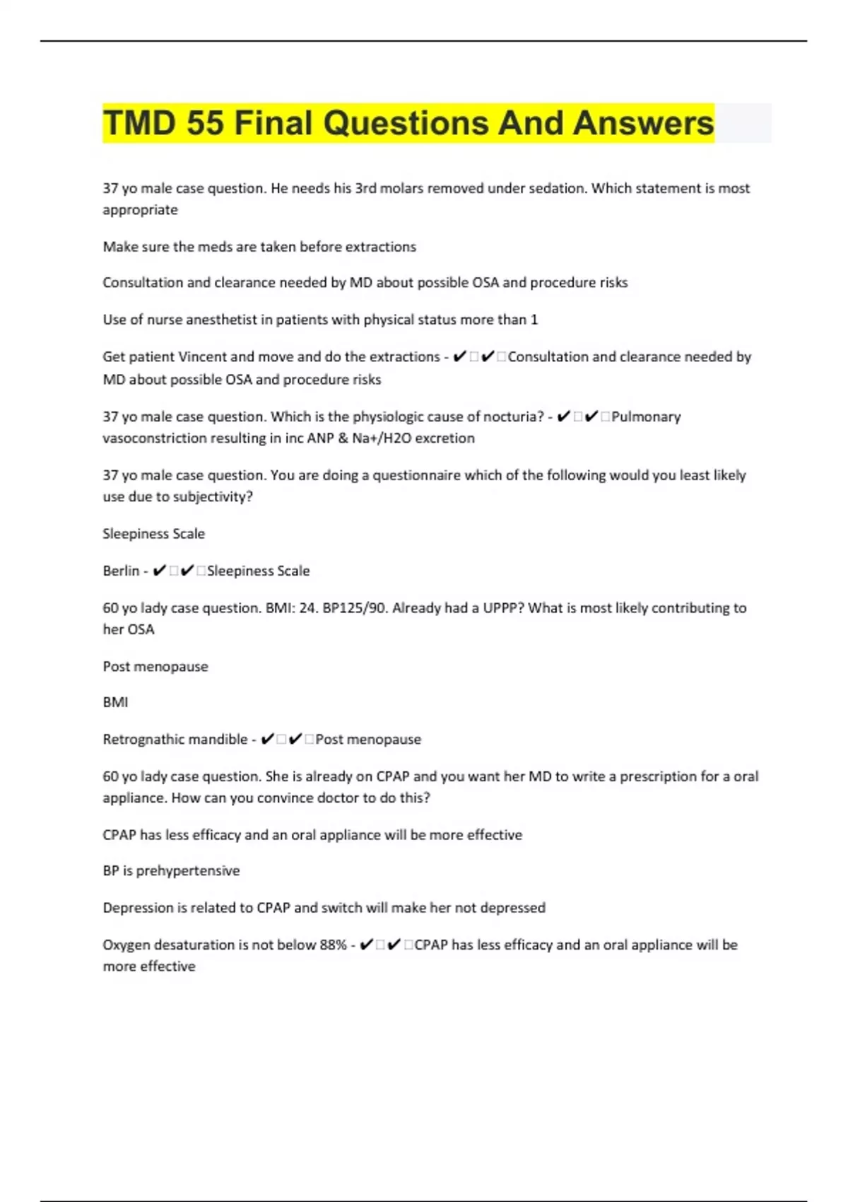 37 yo male case question. He needs his 3rd molars removed under sedation. Which statement is most appropriate Make sure the meds are taken before extractions Consultation and clearance needed by MD about possible OSA and procedure risks Use of nurse anesthetist in patients with physical status more than 1 Get patient Vincent and move and do the extractions - ️️Consultation and clearance needed by MD about possible OSA and procedure risks 37 yo male case question. Which is the physiologic cause of nocturia? - ️️Pulmonary vasoconstriction resulting in inc ANP & Na+/H2O excretion 37 yo male case question. You are doing a questionnaire which of the following would you least likely use due to subjectivity? Sleepiness Scale Berlin - ️️Sleepiness Scale 60 yo lady case question. BMI: 24. BP125/90. Already had a UPPP? What is most likely contributing to her OSA Post menopause BMI Retrognathic mandible - ️️Post menopause 60 yo lady case question. She is already on CPAP and you want her MD to write a prescription for a oral appliance. How can you convince doctor to do this? CPAP has less efficacy and an oral appliance will be more effective BP is prehypertensive Depression is related to CPAP and switch will make her not depressed Oxygen desaturation is not below 88% - ️️CPAP has less efficacy and an oral appliance will be more effective