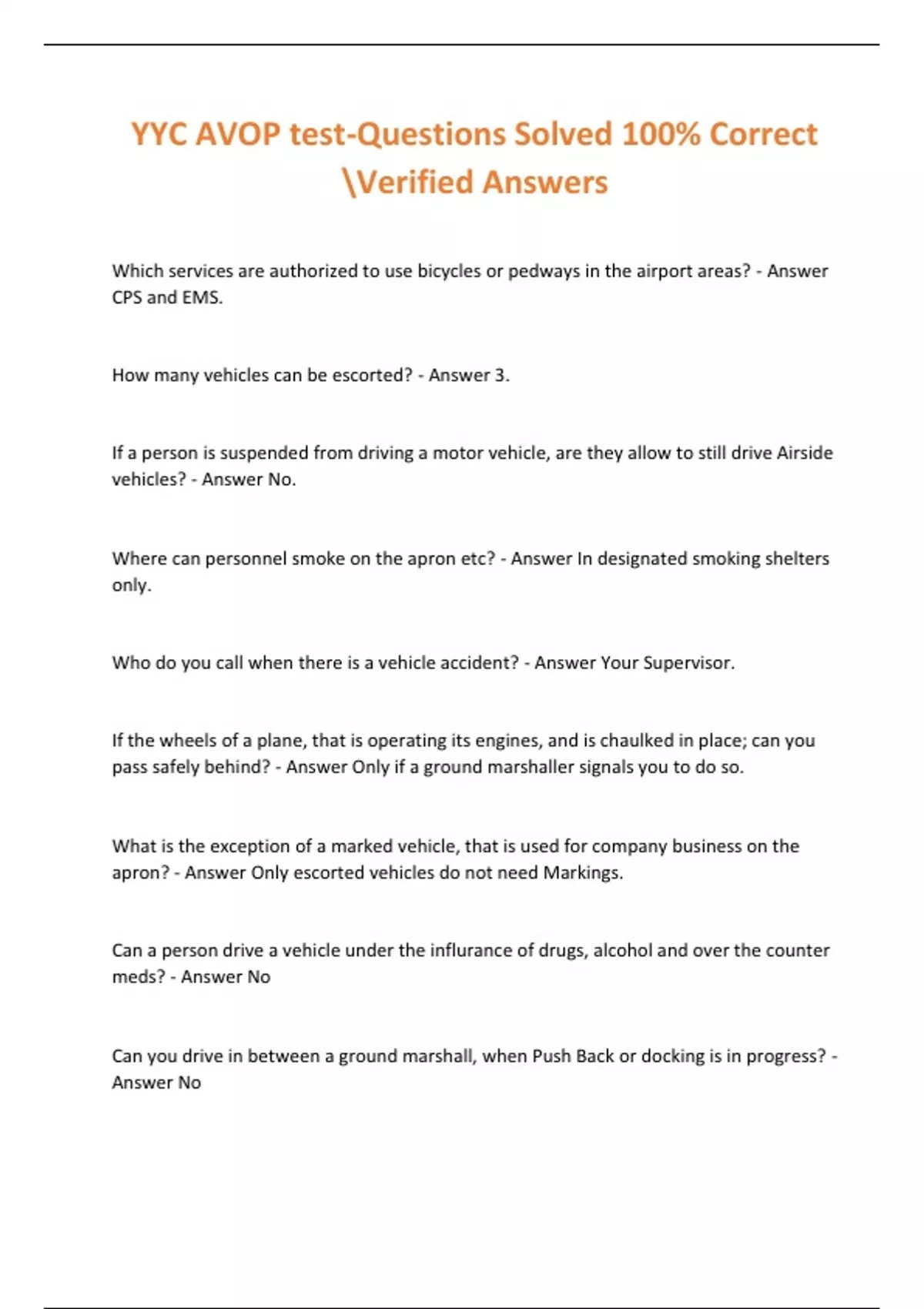 YYC AVOP test-Questions Solved 100% Correct \Verified Answers Which services are authorized to use bicycles or pedways in the airport areas? - Answer CPS and EMS. How many vehicles can be escorted? - Answer 3. If a person is suspended from driving a motor vehicle, are they allow to still drive Airside vehicles? - Answer No. Where c an personnel smoke on the apron etc? - Answer In designated smoking shelters only. Who do you call when there is a vehicle accident? - Answer Your Supervisor. If the wheels of a plane, that is operating its engines, and is chaulked in place; can you pass safely behind? - Answer Only if a ground marshaller signals you to do so. What is the exception of a marked vehicle, that is used for company business on the apron? - Answer Only escorted vehicles do not need Markings. Can a person drive a vehicle under the influrance of drugs, alcohol and over the counter meds? - Answer No Can you drive in between a ground marshall, when Push Back or docking is in progress? - Answer No When are Cell phone use authorized? - Answer When parked in a safe place only. What is the safe distance of a fence, while leaving a vehicle unattended? - Answer 1 meter If a vehicle operator notices debris that can be a hazard to people and aircraft, what shall they do? - Answer With safe practice ens ure that they can remove the article. If a condition exists that can cause damage to an aircraft, who do you report it to? - Answer The Duty Manager and your Supervisor. When is an AVOP suspended or returned? - Answer No longer employed at YYC or not in a position that requires airside vehicles. When can a AVOP be suspended as well? - Answer In the Public Interest or non -punitive reasons. Who authorizes vehicle regulations? - Answer CCoC Safety Compliance Officer CPS YYCA How are airside vehicle operat ors regulated at YYC? - Answer Point Record Keeping system. If a AVOP vehicle operator has received a violation ticket, who is to represent the offender? - Answer Employment rpresentative.