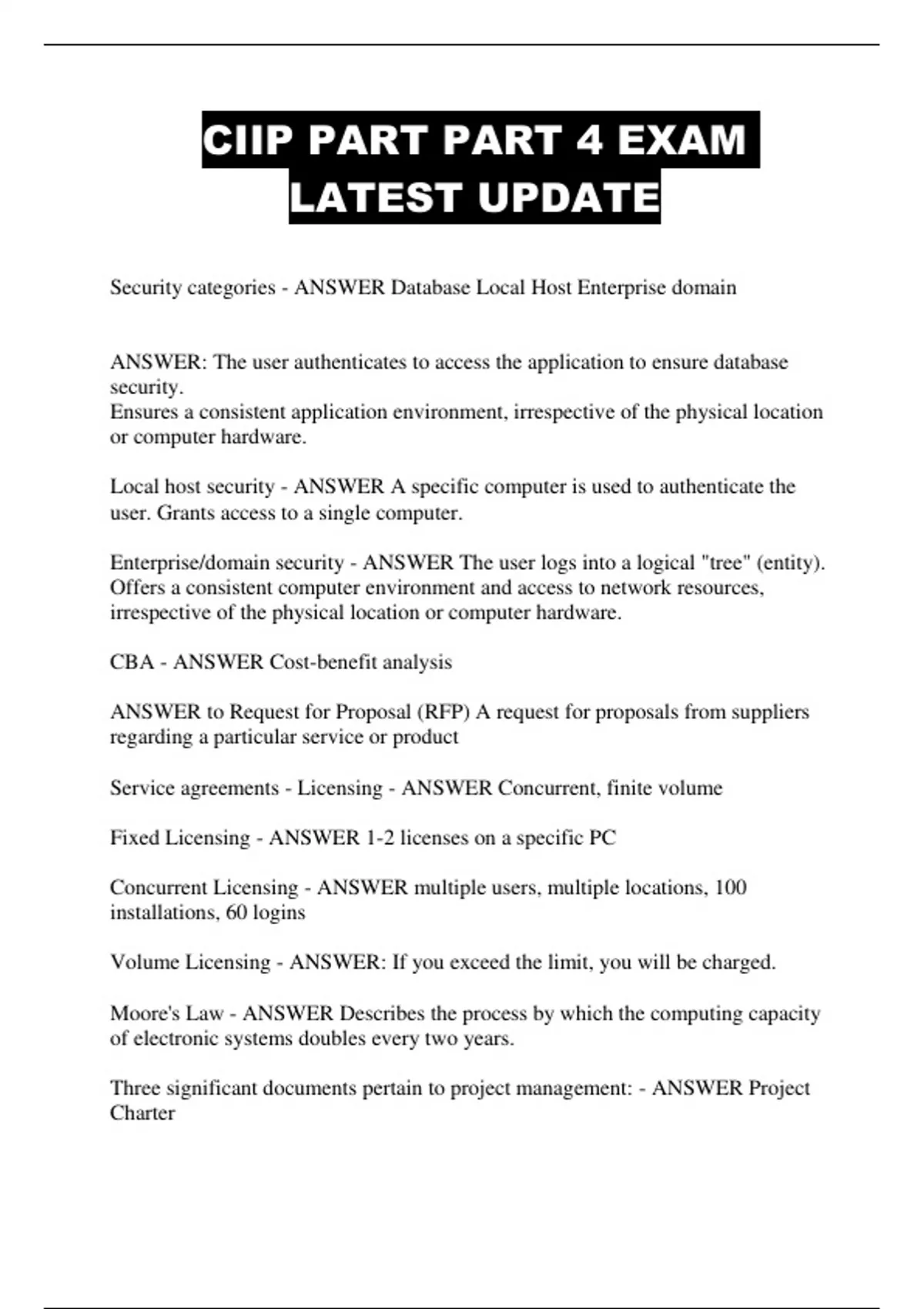 CIIP PART PART 4 EXAM LATEST UPDATE Security categories - ANSWER Database Local Host Enterprise domain ANSWER: The user authenticates to access the application to ensure database security. Ensures a consistent application environment, irrespective of the physical location or computer hardware. Local host security - ANSWER A specific computer is used to authentica te the user. Grants access to a single computer. Enterprise/domain securit y - ANSWER The user logs into a logical "tree" (entity). Offers a consistent computer environment and access to network resources, irrespective of the physical location or computer hardware. CBA - ANSWER Cost-benefit analysis ANSWER to Request for Proposal (RFP) A request for proposals from suppliers regarding a particular service or product Service agreements - Licensing - ANSWER Concurrent, finite volume Fixed Licensing - ANSWER 1-2 licenses on a specific PC Concurrent Licensing - ANSWER multiple users, multiple locations, 100 installations, 60 logins Volume Licensing - ANSWER: If you exceed the limit, you will be charged. Moore's Law - ANSWER Describes the process by which the computing capaci ty of electronic systems doubles every two years. Three significant documents pertain to project management: - ANSWER Project Charter