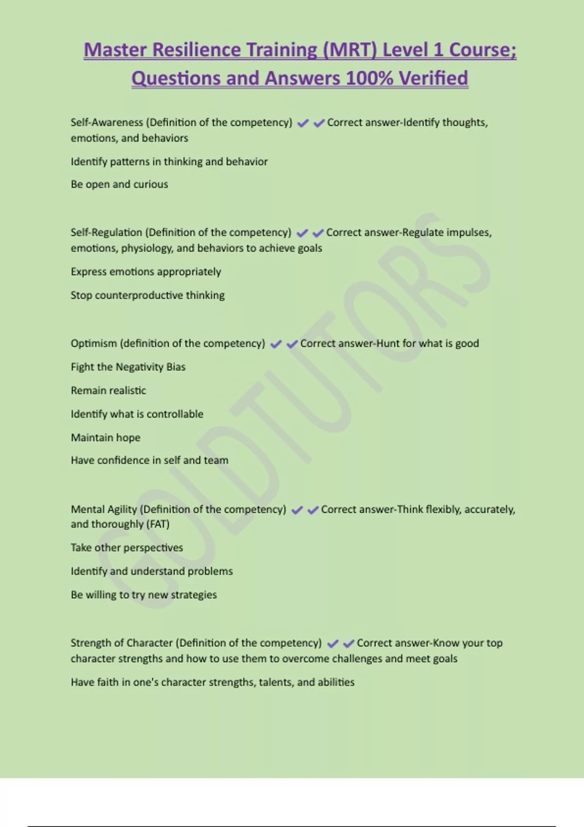 Master Resilience Training (MRT) Level 1 Course; Questions and Answers 100% Verified Self-Awareness (Definition of the competency) Correct answer-Identify thoughts, emotions, and behaviors Identify patterns in thinking and behavior Be open and curious Self-Regulation (Definition of the competency) Correct answer-Regulate impulses, emotions, physiology, and behaviors to achieve goals Express emotions appropriately Stop counterproductive thinking