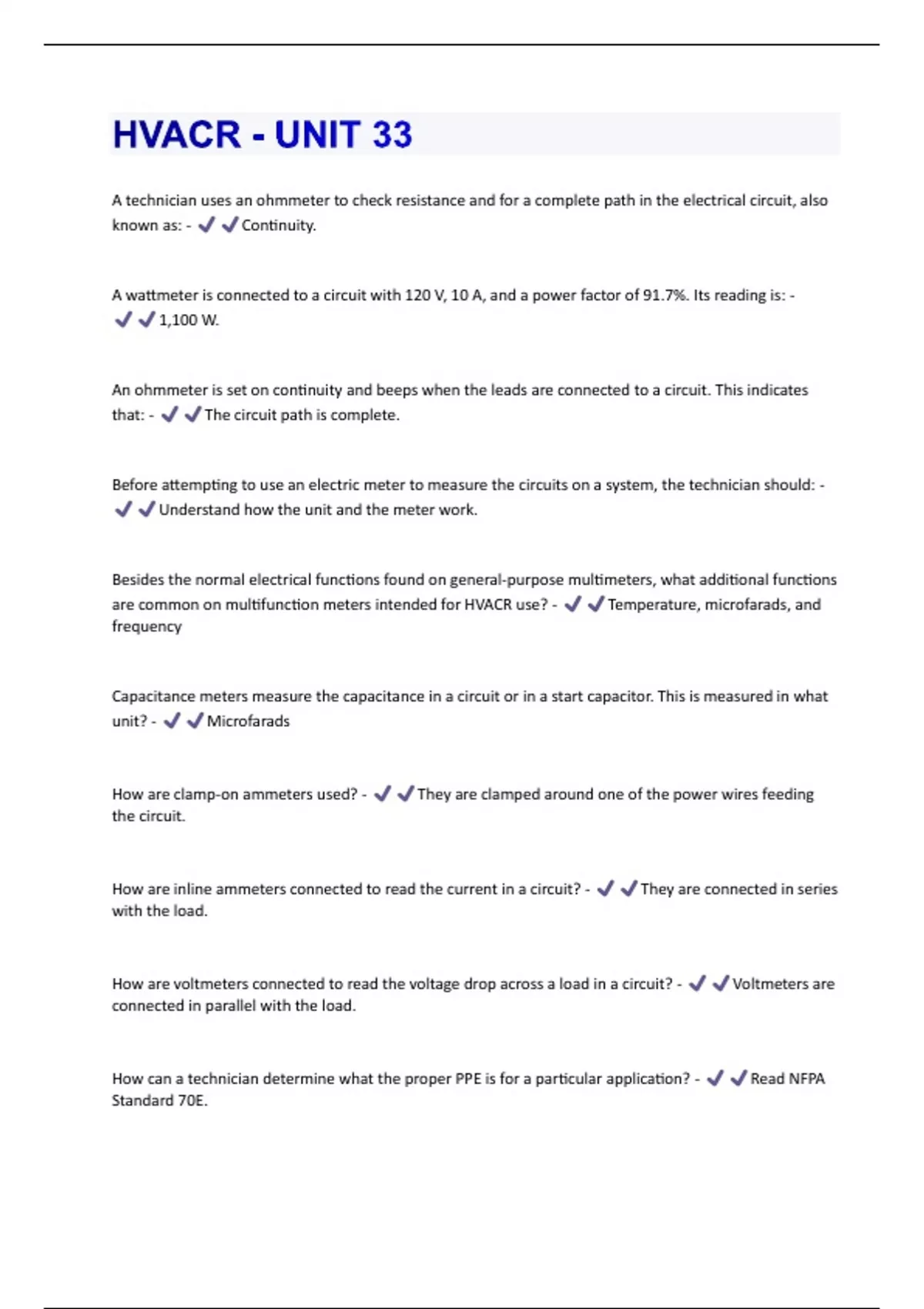 A technician uses an ohmmeter to check resistance and for a complete path in the electrical circuit, also known as: - Continuity. A wattmeter is connected to a circuit with 120 V, 10 A, and a power factor of 91.7%. Its reading is: - 1,100 W. An ohmmeter is set on continuity and beeps when the leads are connected to a circuit. This indicates that: - The circuit path is complete. Before attempting to use an electric meter to measure the circuits on a system, the technician should: - Understand how the unit and the meter work. Besides the normal electrical functions found on general-purpose multimeters, what additional functions are common on multifunction meters intended for HVACR use? - Temperature, microfarads, and frequency Capacitance meters measure the capacitance in a circuit or in a start capacitor. This is measured in what unit? - Microfarads How are clamp-on ammeters used? - They are clamped around one of the power wires feeding the circuit. How are inline ammeters connected to read the current in a circuit? - They are connected in series with the load. How are voltmeters connected to read the voltage drop across a load in a circuit? - Voltmeters are connected in parallel with the load. How can a technician determine what the proper PPE is for a particular application? - Read NFPA Standard 70E.How does a weighted average meter measure alternating current? - It takes an average over a short period of time. Meter functions commonly used for air-conditioning troubleshooting include: - Volts, amps, and ohms. One advantage of digital meters is: - There is no need to interpret the scale. Root-mean square (RMS) is a mathematical formula for: - Calculating the electrical power passing through a alternating current circuit. The range of an electric meter describes: - How low and high the meter will read for each function. The safest way to use a meter while testing for voltage is to: - Rest the meter on something; do not hold it. This test instrument reads current in an electrical circuit. - Ammeter Wattmeters read true power in a circuit. This can be expressed by what equation? - Power = amps × voltage × power factor What category of electric meter is intended for measurement at the electric meter base? - Category IV What category of electric meter is intended only for measurement inside an appliance? - Category I What could happen to an analog meter if a voltage is tested that exceeds the setting on the meter? - The meter can be damaged.What is a common application for data logging instruments? - Identifying intermittent problems What is a transient voltage? - A momentary surge or spike of voltage that can be several times the normal circuit voltage What is the operating principle of an analog voltmeter? - Current passes through a coil, which creates magnetism that moves a needle. What part of an analog scale gives the most accurate reading? - The midpoint of the scale What scales on analog meters require battery power to operate? - Only the ohms scale What should you look for on the meter besides a CAT rating? - A certification from an independent laboratory