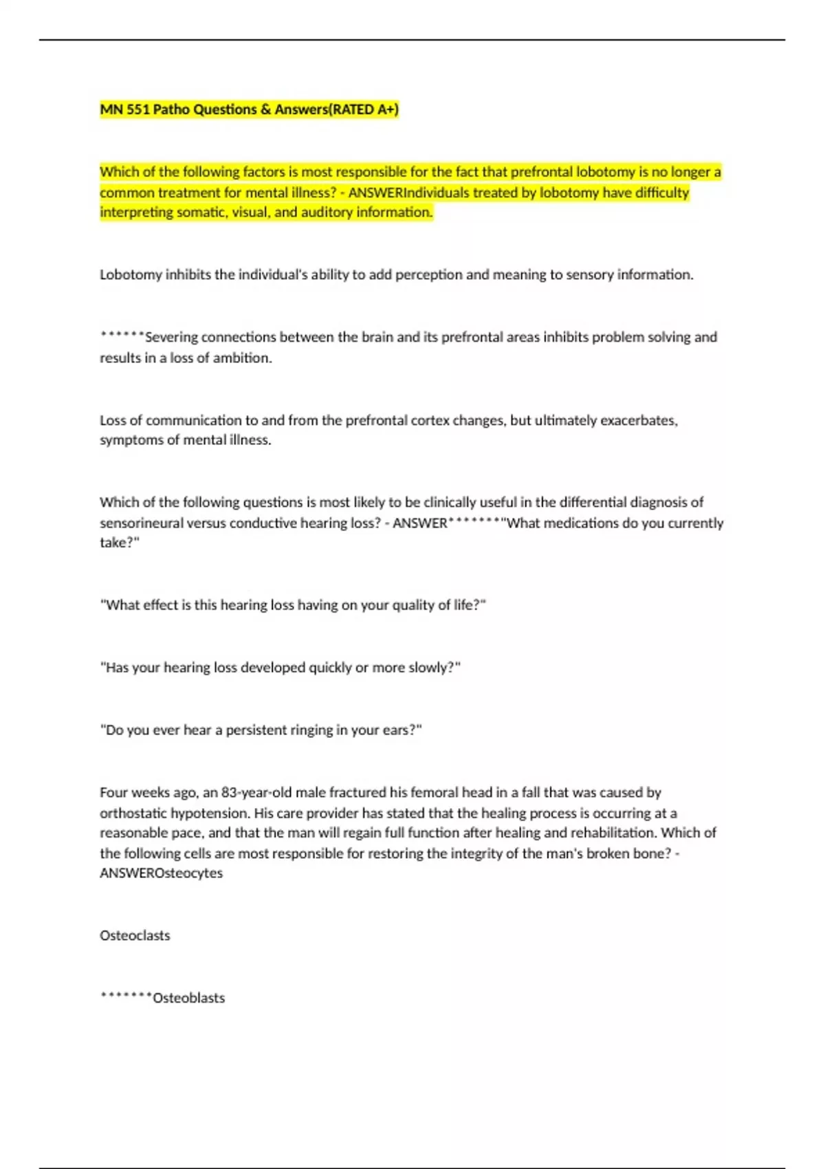 common treatment for mental illness? - ANSWERIndividuals treated by lobotomy have difficulty interpreting somatic, visual, and auditory information.