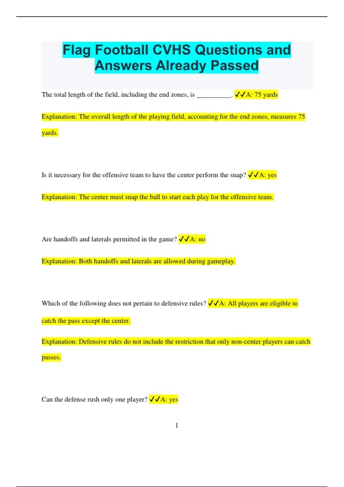 Flag Football CVHS Questions and Answers Already Passed