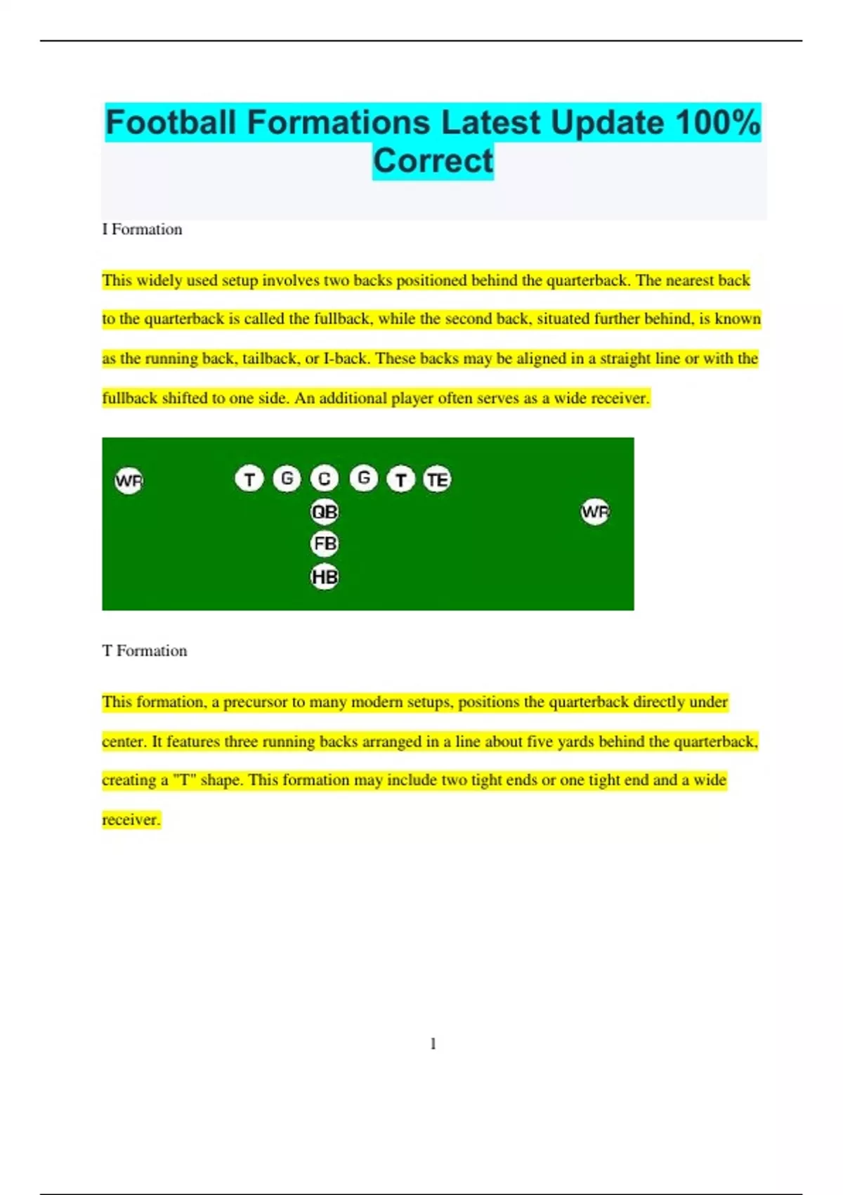 Football Formations Latest Update 100% Correct I Formation This widely used setup involves two backs positioned behind the quarterback. The nearest back to the quarterback is called the fullback, while the second back, situated further behind, is known as the running back, tailback, or I-back. These backs may be aligned in a straight line or with the fullback shifted to one side. An additional player often serves as a wide receiver. T Formation This formation, a precursor to many modern setups, positions the quarterback directly under center. It features three running backs arranged in a line about five yards behind the quarterback, creating a "T" shape. This formation may include two tight ends or one tight end and a wide receiver. 2 I Formation with Fullback Offset (Strongside) In this variation, the fullback is positioned to the strong side of the offensive line, along with the tight end. I Formation with Fullback Offset (Weakside) Here, the fullback is aligned to the weak side of the offensive line, accompanied by the tight end. Maryland I Formation 3 This version of the I Formation has three running backs and no flanker, with the fullback and two halfbacks lined up directly behind the quarterback. Power I Formation A variation that includes two fullbacks (one offset) and one halfback positioned behind the quarterback, without a flanker.