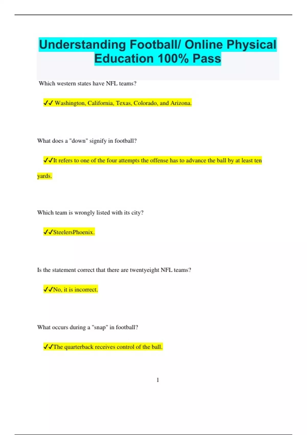 Understanding Football/ Online Physical Education 100% Pass Which western states have NFL teams? Washington, California, Texas, Colorado, and Arizona. What does a "down" signify in football? It refers to one of the four attempts the offense has to advance the ball by at least ten yards. Which team is wrongly listed with its city? SteelersPhoenix. Is the statement correct that there are twentyeight NFL teams? No, it is incorrect. What occurs during a "snap" in football? The quarterback receives control of the ball. 2 What is the main objective of the defensive team? To block the opposing team from progressing the ball. What does the offensive team strive to do? To score by advancing the ball, either by running or passing. How is a reception defined in football? When a player successfully catches a pass from the quarterback. What is the societal effect of American football in the U.S. and internationally?