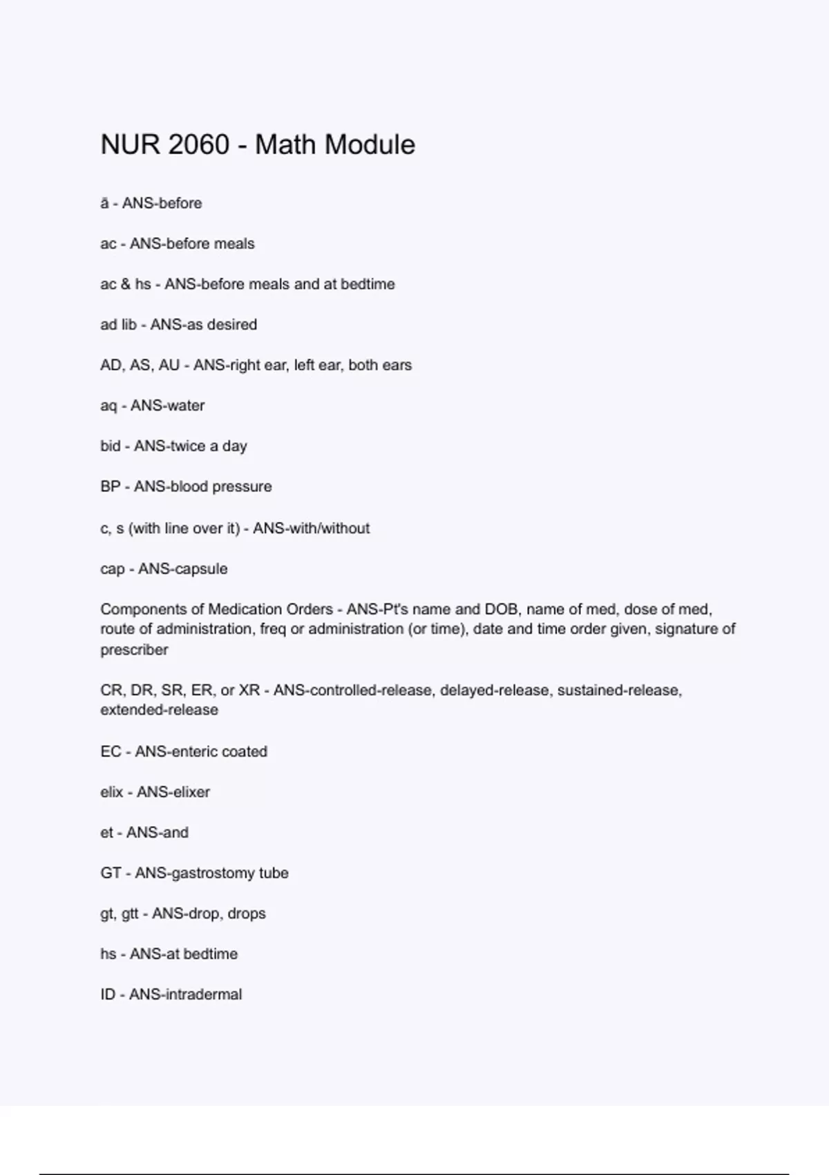 NUR 2060 - Math Module Questions with correct Answers, 100% verified , Graded A+ latest update 2024 with complete solution