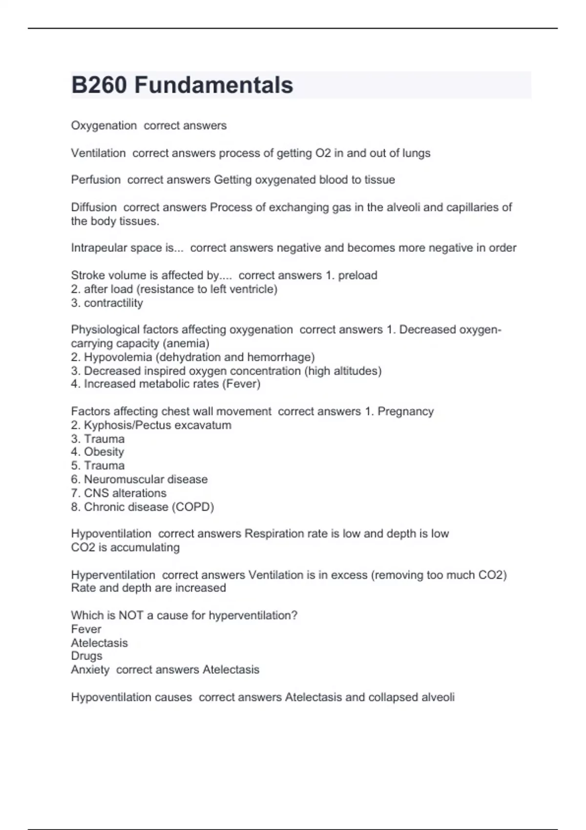 Oxygenation correct answers Ventilation correct answers process of getting O2 in and out of lungs Perfusion correct answers Getting oxygenated blood to tissue Diffusion correct answers Process of exchanging gas in the alveoli and capillaries of the body tissues. Intrapeular space is... correct answers negative and becomes more negative in order Stroke volume is affected by.... correct answers 1. preload 2. after load (resistance to left ventricle) 3. contractility Physiological factors affecting oxygenation correct answers 1. Decreased oxygen-carrying capacity (anemia) 2. Hypovolemia (dehydration and hemorrhage) 3. Decreased inspired oxygen concentration (high altitudes) 4. Increased metabolic rates (Fever) Factors affecting chest wall movement correct answers 1. Pregnancy 2. Kyphosis/Pectus excavatum 3. Trauma 4. Obesity 5. Trauma 6. Neuromuscular disease 7. CNS alterations 8. Chronic disease (COPD) Hypoventilation correct answers Respiration rate is low and depth is low CO2 is accumulating Hyperventilation correct answers Ventilation is in excess (removing too much CO2) Rate and depth are increased Which is NOT a cause for hyperventilation? Fever Atelectasis Drugs Anxiety correct answers Atelectasis Hypoventilation causes correct answers Atelectasis and collapsed alveoli