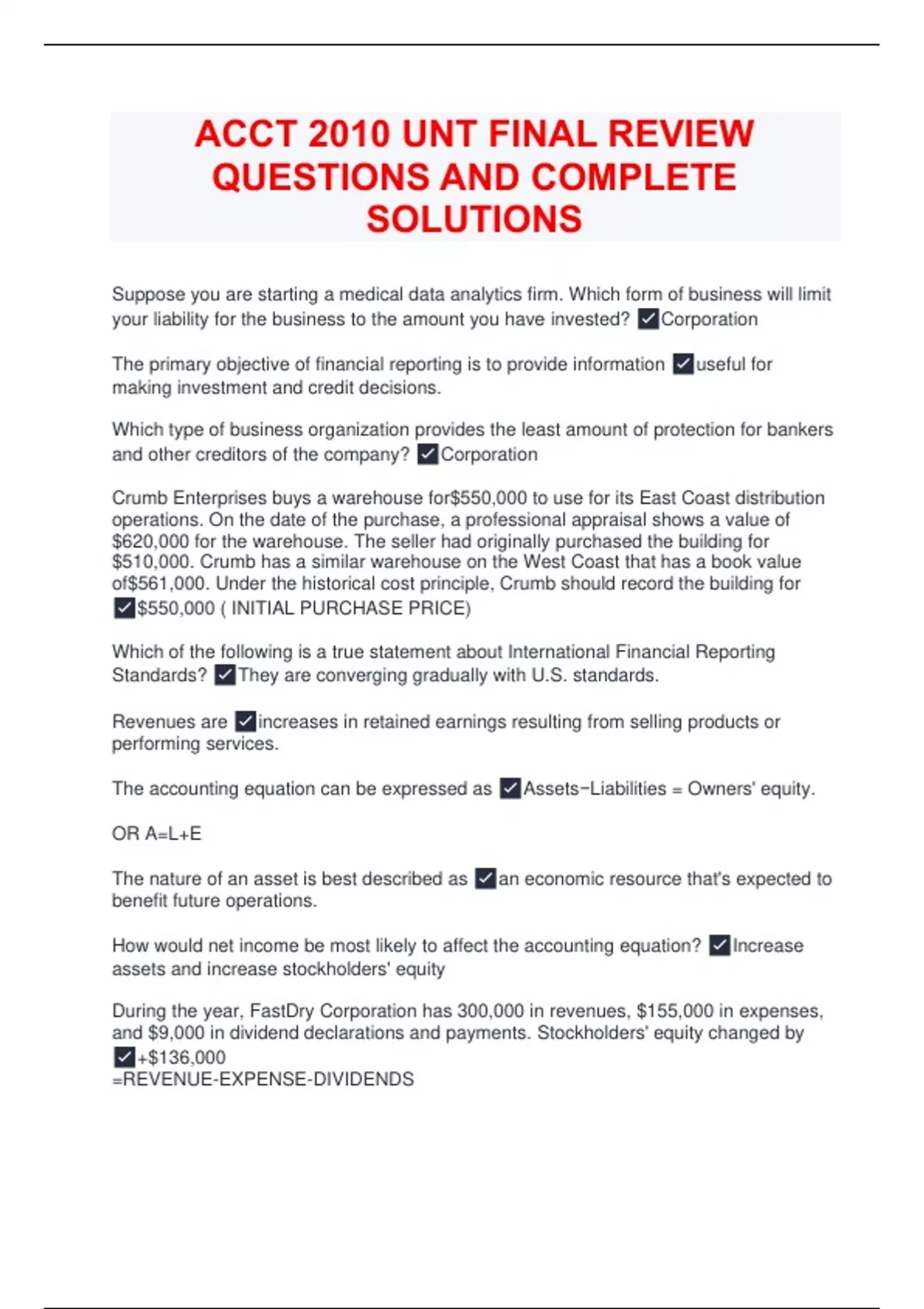 ACCT 2010 UNT FINAL REVIEW QUESTIONS AND COMPLETE SOLUTIONS
