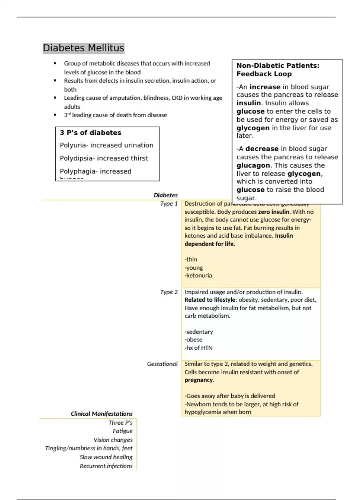 These nursing notes cover Diabetes Mellitus in great detail with review of key terms, different types, manifestations, diagnostics, complications, and highly tested pharmacological interventions.